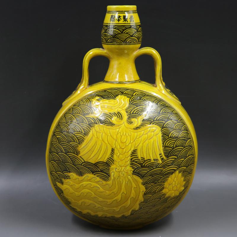 明永樂彩繪暗刻海水鳳紋抱月瓶家居老貨瓷器客廳擺件古董古玩收藏1入