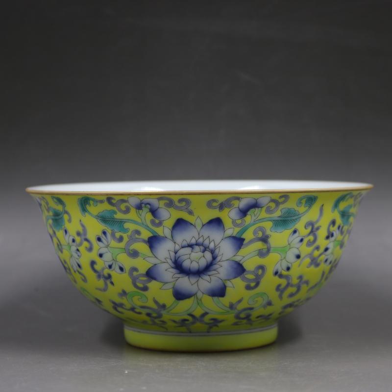 清雍正黃地粉彩描金纏枝花紋碗手繪仿古老貨家居瓷器擺件古董古玩1入