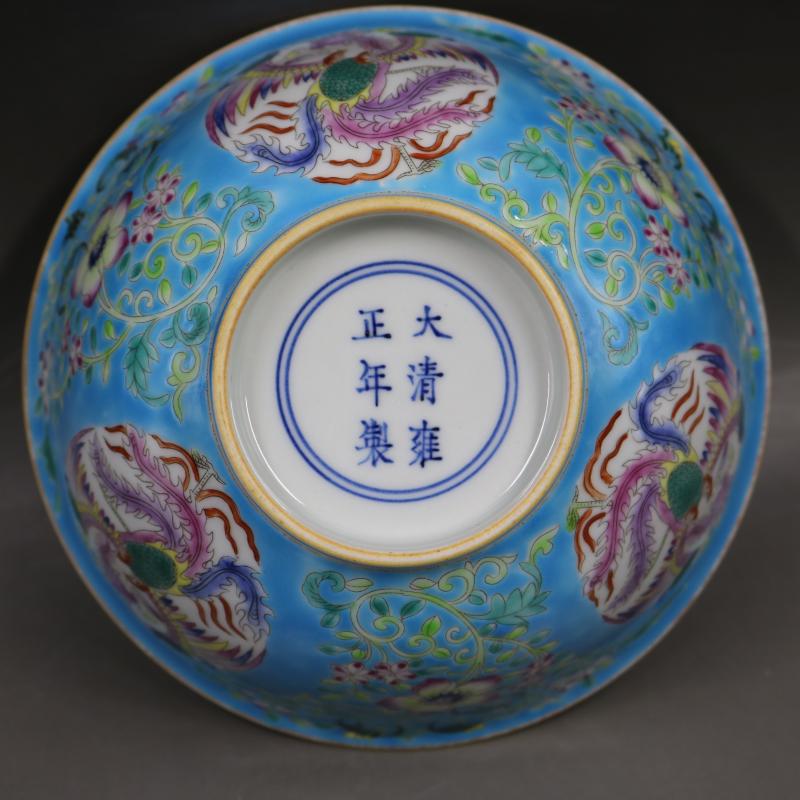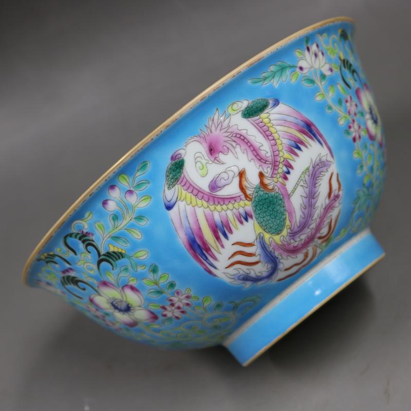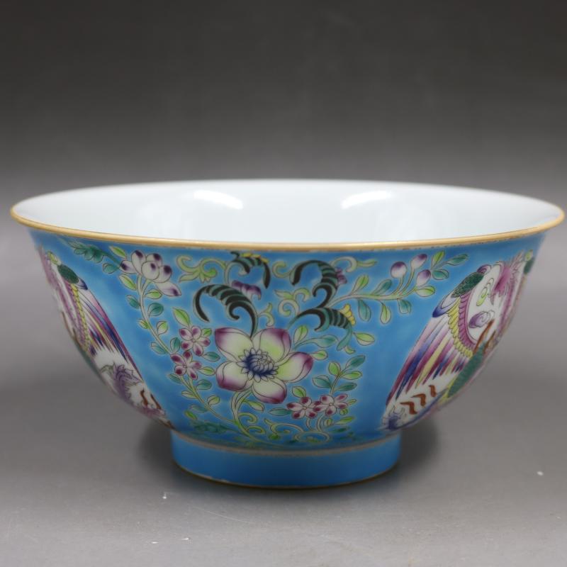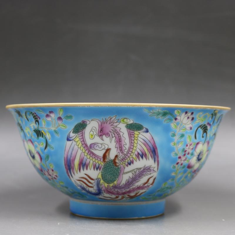 清雍正藍地粉彩描金團鳳花紋碗手繪仿古老貨家居瓷器擺件古董古玩1入