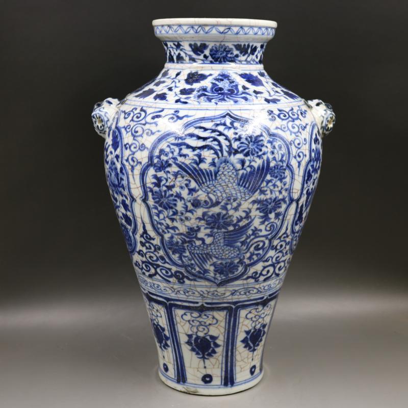 元開片釉青花穿花鳳紋狗頭罐手繪仿古老貨家居瓷器擺件古董古玩1入