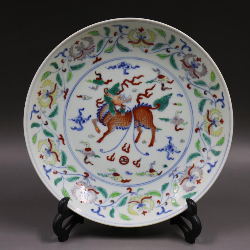 大明成化青花斗彩穿花麒麟紋盤手繪仿古家居瓷器擺件古董古玩收藏1入