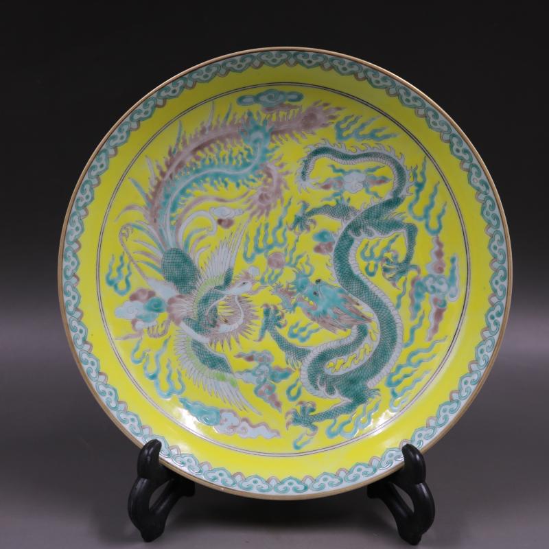 清雍正黃地粉彩描本金龍鳳盤仿古老貨瓷器家居博古架擺件古董古玩1入