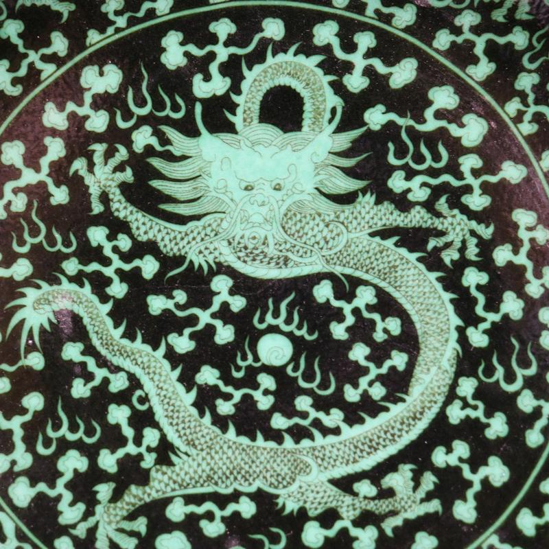 清雍正黑地粉彩描本金五龍盤仿古老貨瓷器家居博古架擺件古董古玩1入