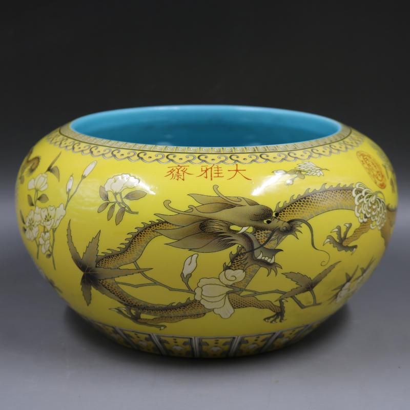 清慈禧時間黃地描金墨彩龍紋水盂水洗家居仿古瓷器裝飾擺件古玩1入