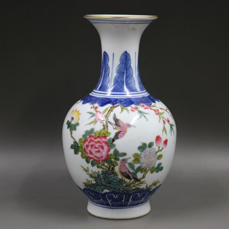 大清乾隆青花粉彩花鳥賞瓶手繪仿古家居裝飾瓷器擺件古董古玩收藏1入