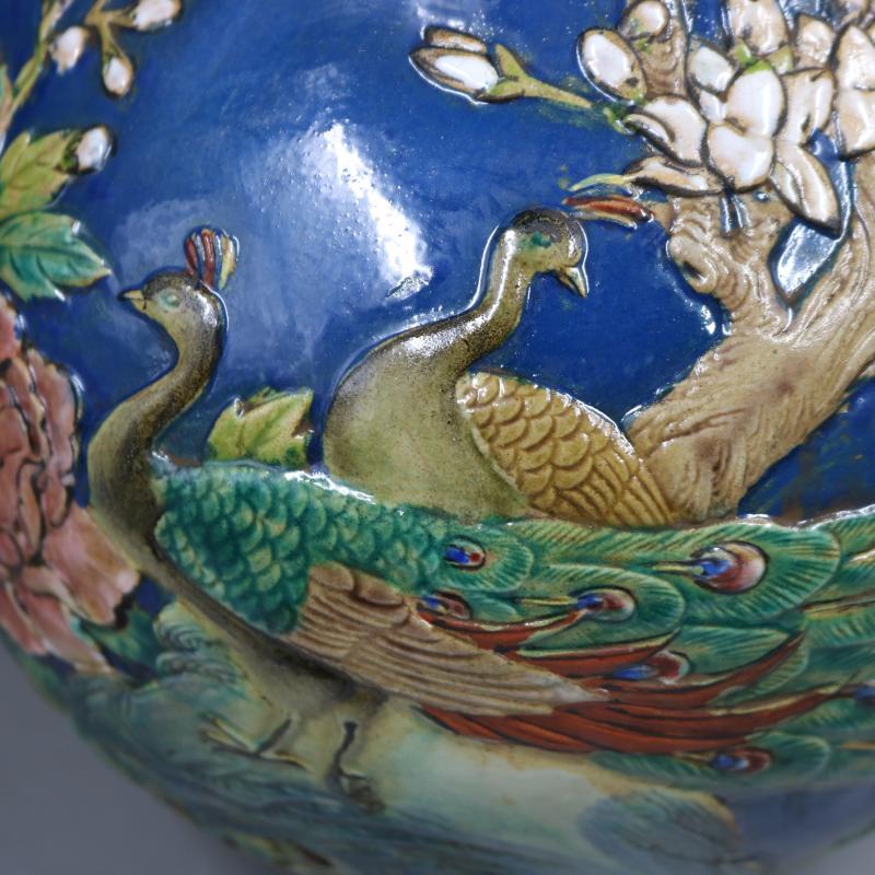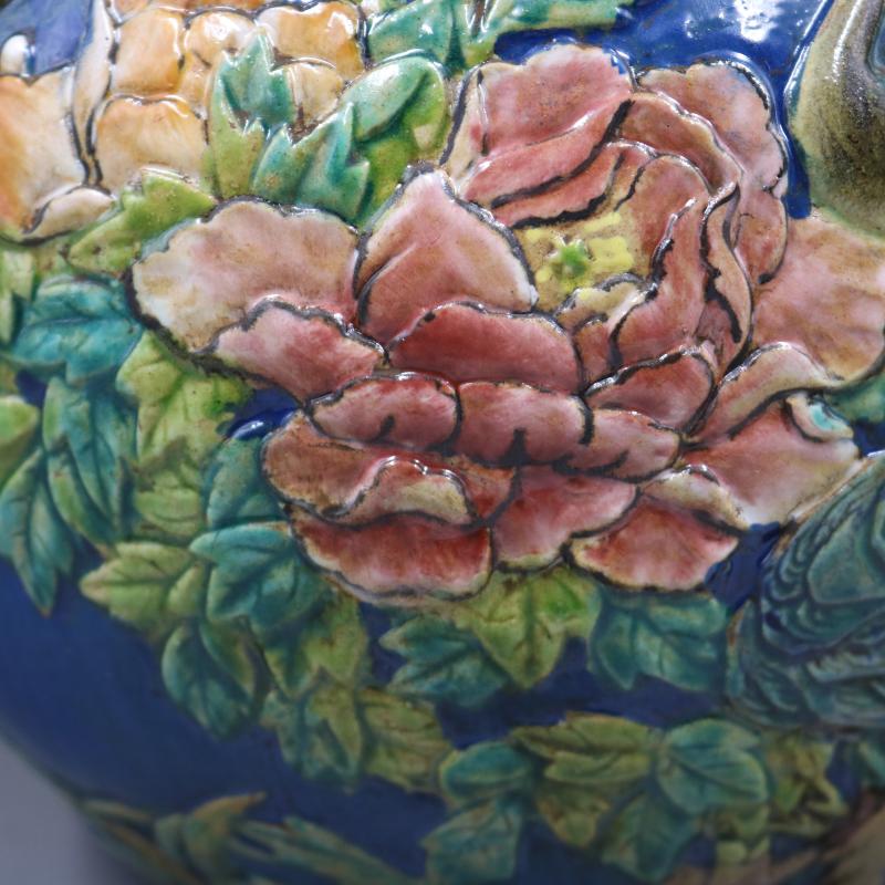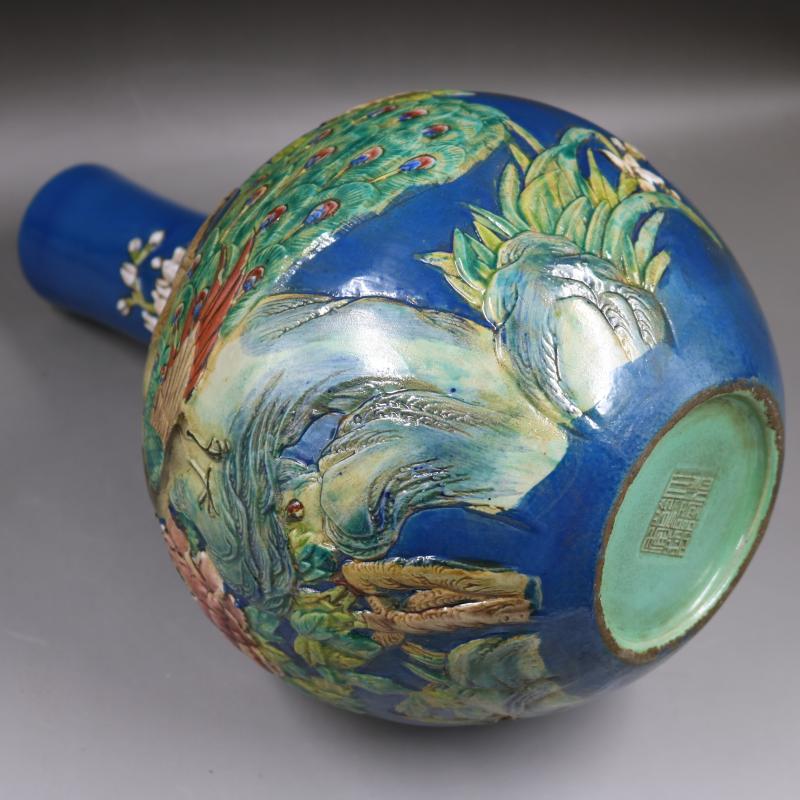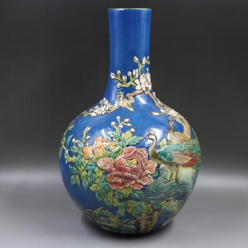 [2]清乾隆藍地粉彩浮雕刻花鳥天球瓶仿古家居裝飾瓷器擺件古董古玩1入