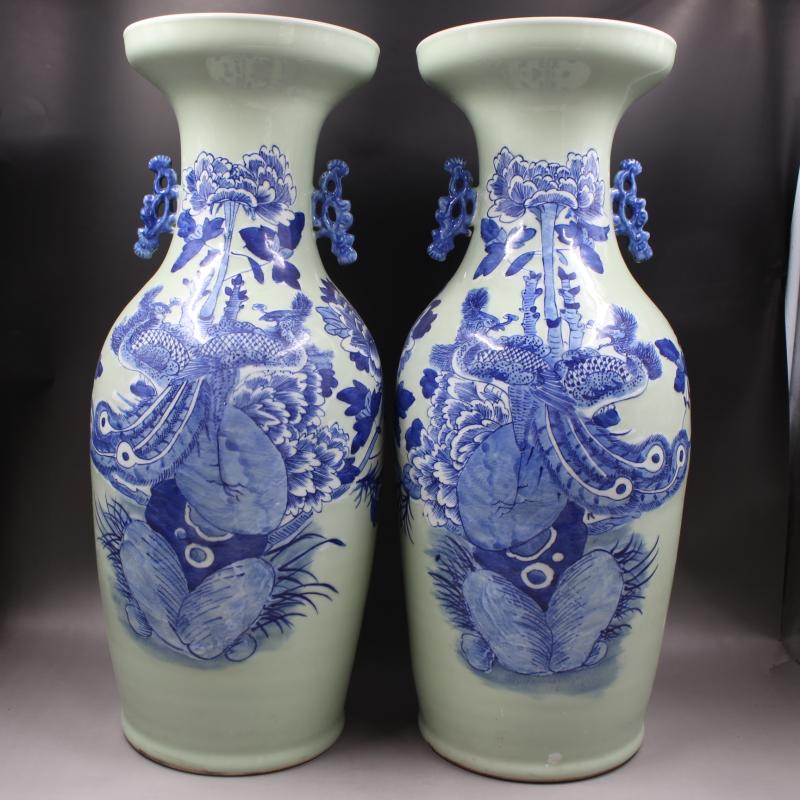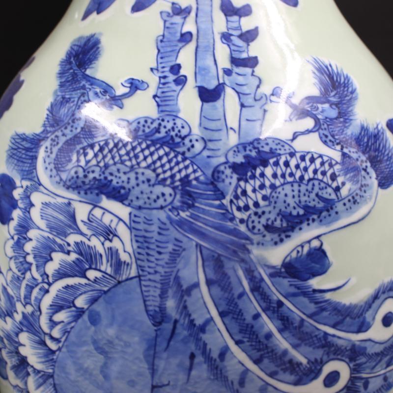 清康熙年制豆青釉青花鳳戲牡丹對瓶仿古瓷器家居擺件古董古玩收藏1入
