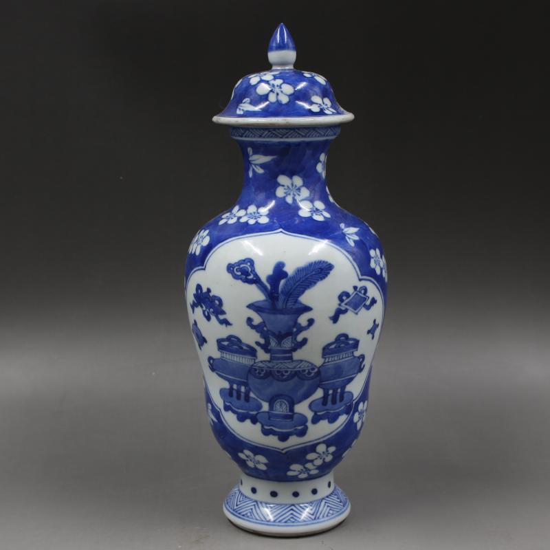 清康熙年制青花博古紋蓋罐手繪景德鎮仿古瓷器家居擺件古董古玩1入