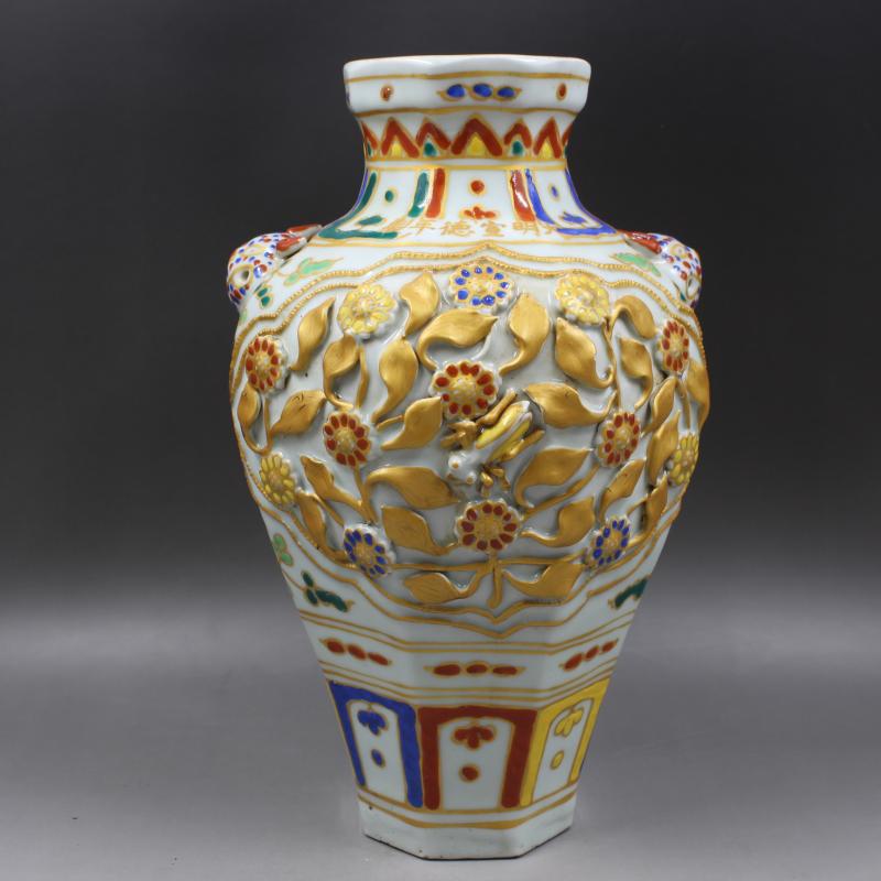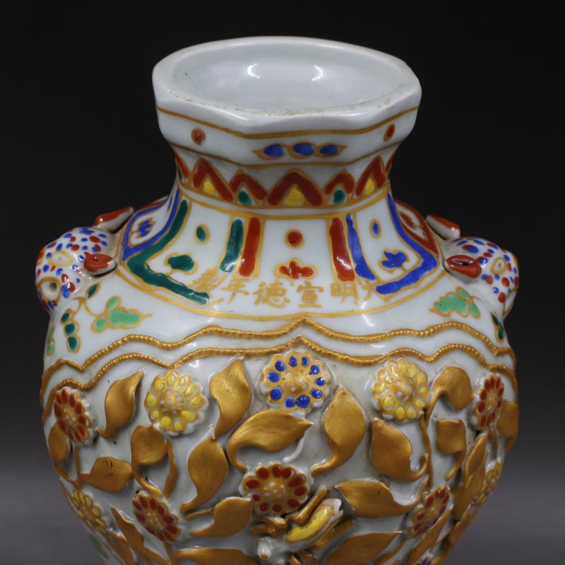 大明宣德年制捏花五彩花紋虎頭罐瓶手繪仿古瓷器家居擺件古玩收藏1入