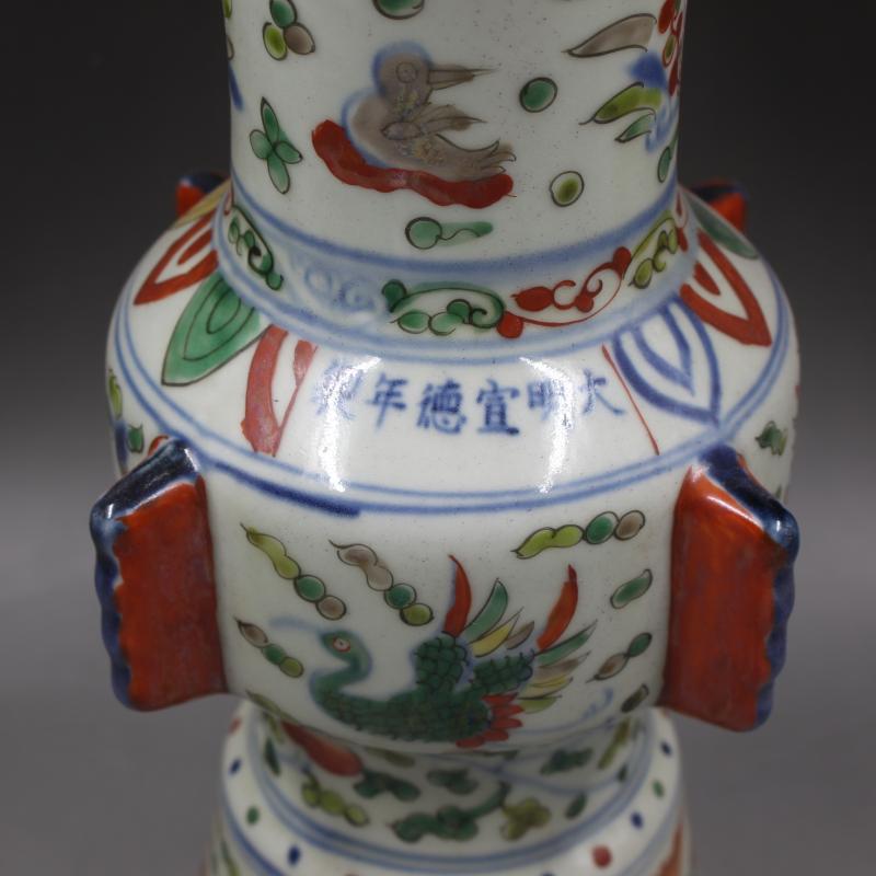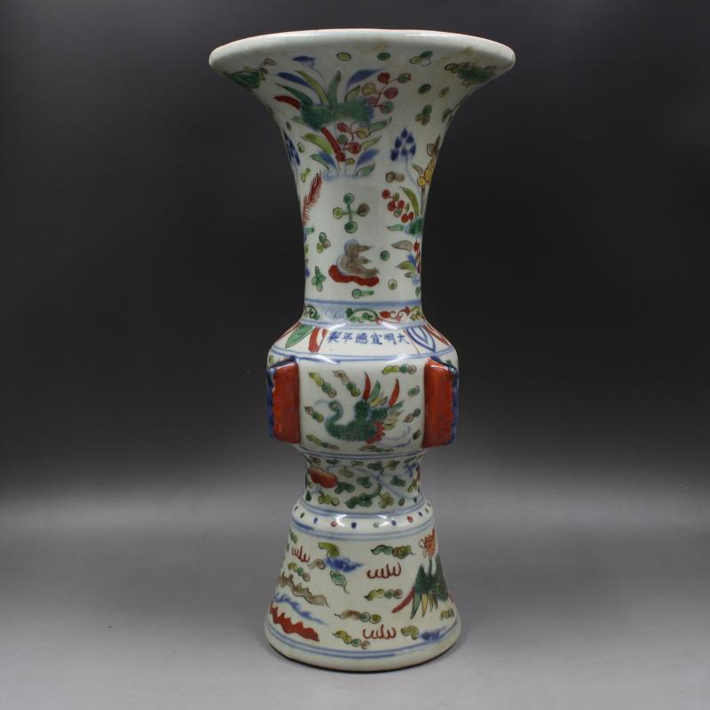 大明宣德年制青花五彩荷花鴛鴦出戰觚手繪仿古瓷器家居擺件古玩1入
