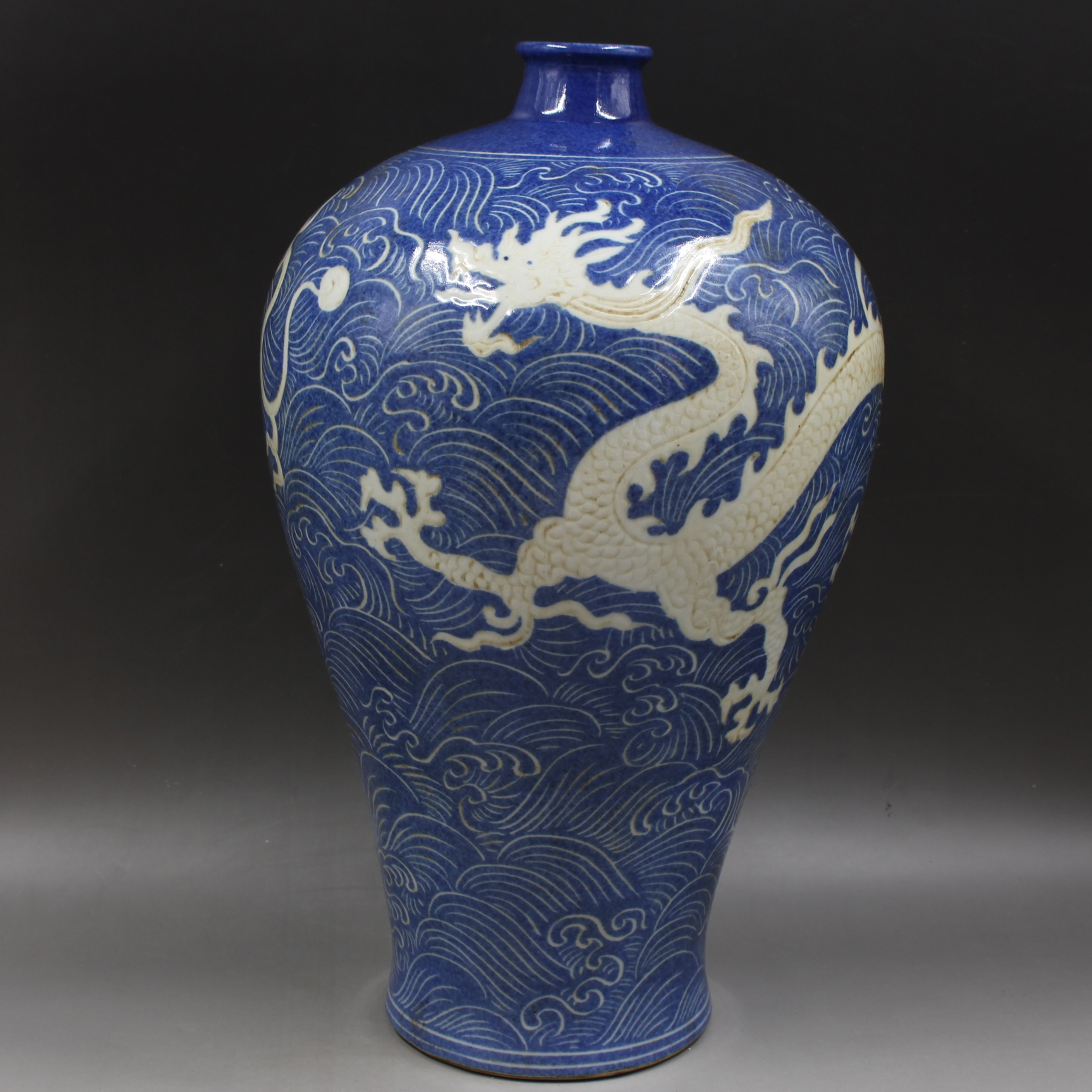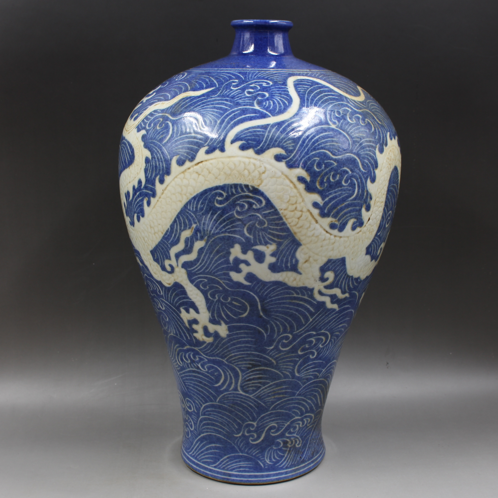 元青花留白雕刻海水龍紋梅瓶手工仿古瓷器家居博古架擺件古玩收藏1入