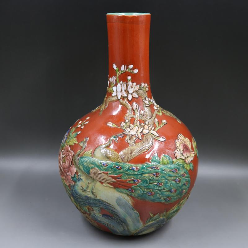 清乾隆紅地粉彩浮雕刻花鳥天球瓶仿古家居裝飾瓷器擺件古董古玩1入