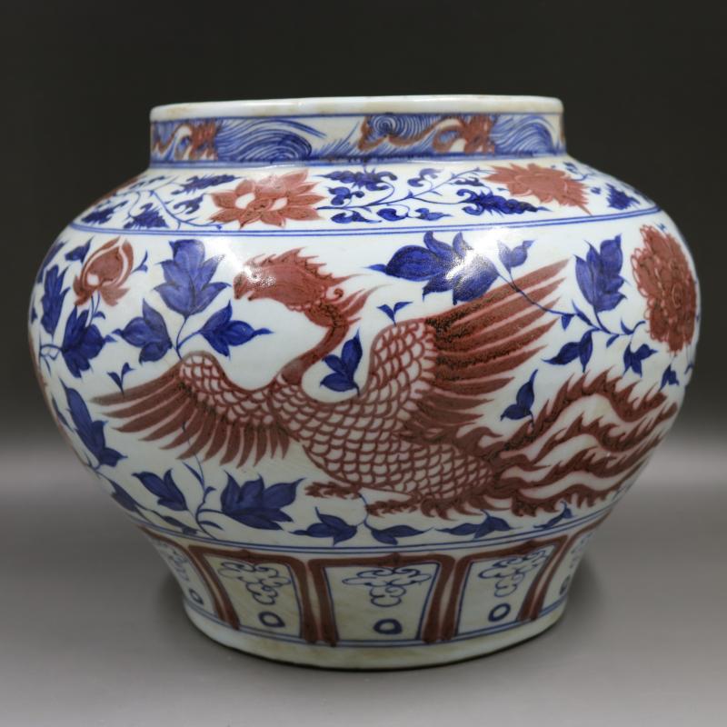 元青花釉里紅穿花鳳紋大罐手繪仿古老貨家居裝飾擺件瓷器古玩收藏1入