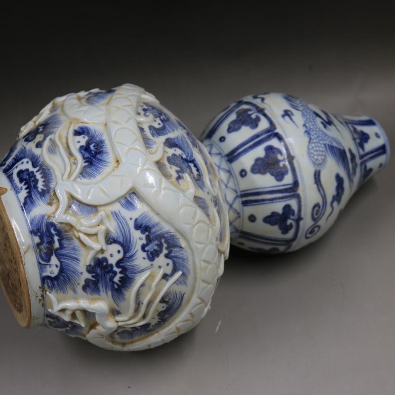 元青花浮雕刻水龍紋葫蘆瓶手工仿古老貨家居裝飾瓷器擺件古董古玩1入