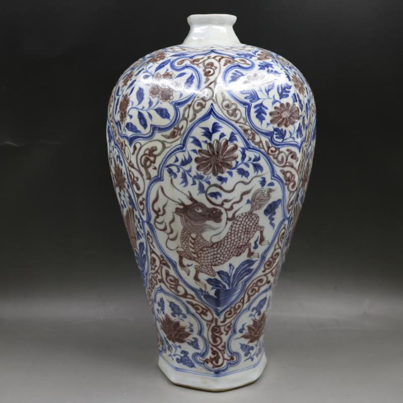 元青花釉里紅麒麟鳳紋八方梅瓶手繪仿古老貨家居復古裝飾瓷器擺件1入