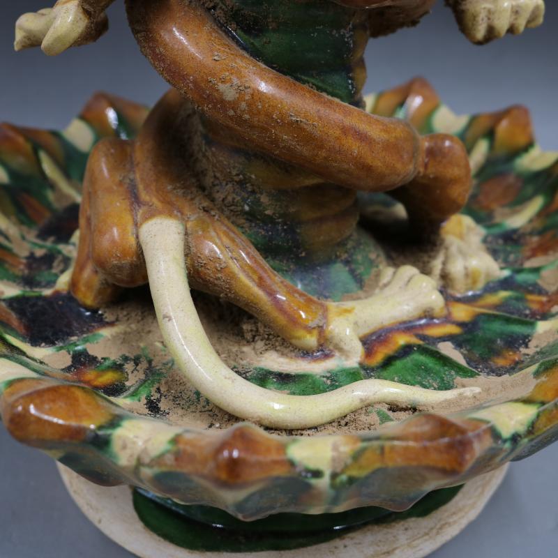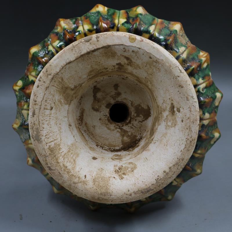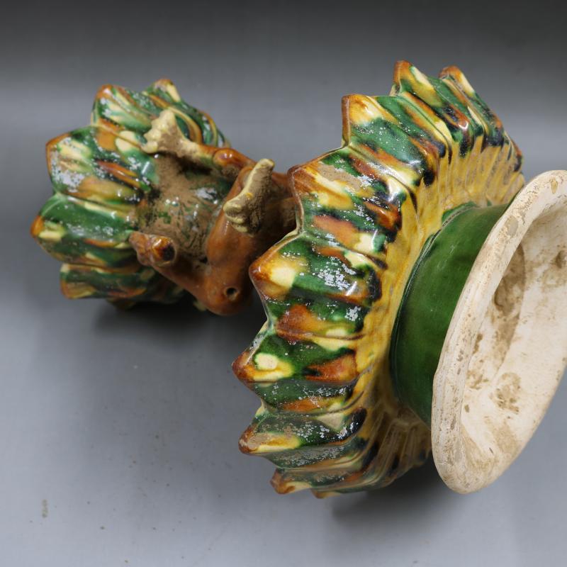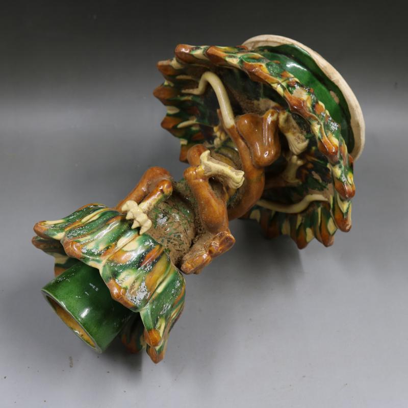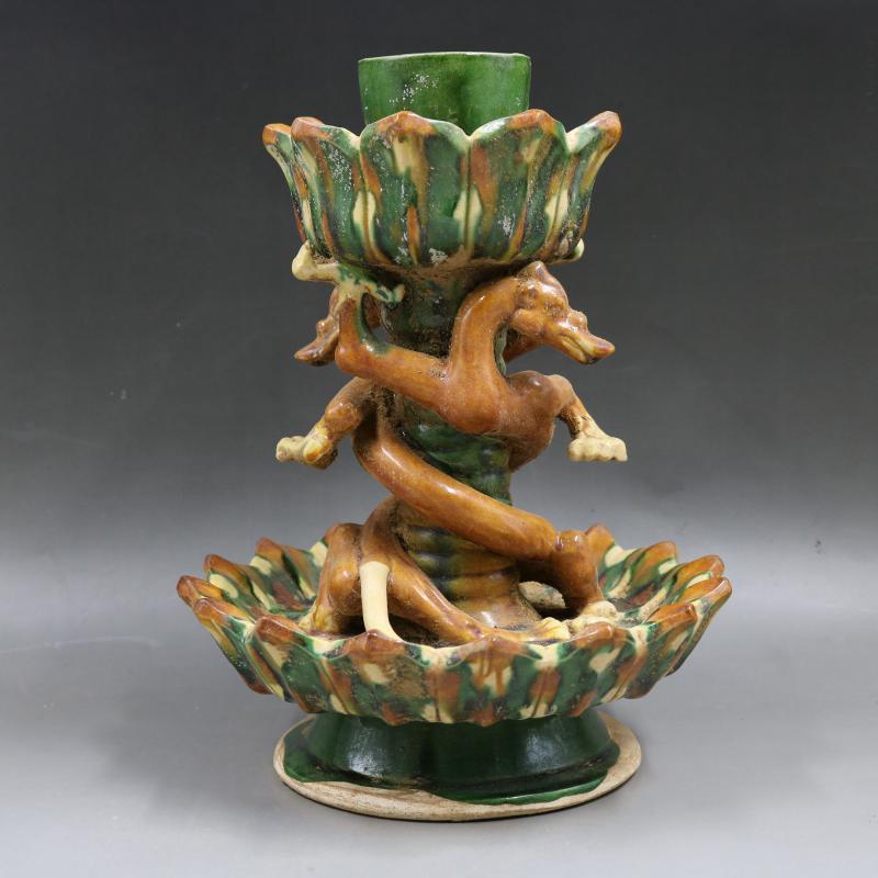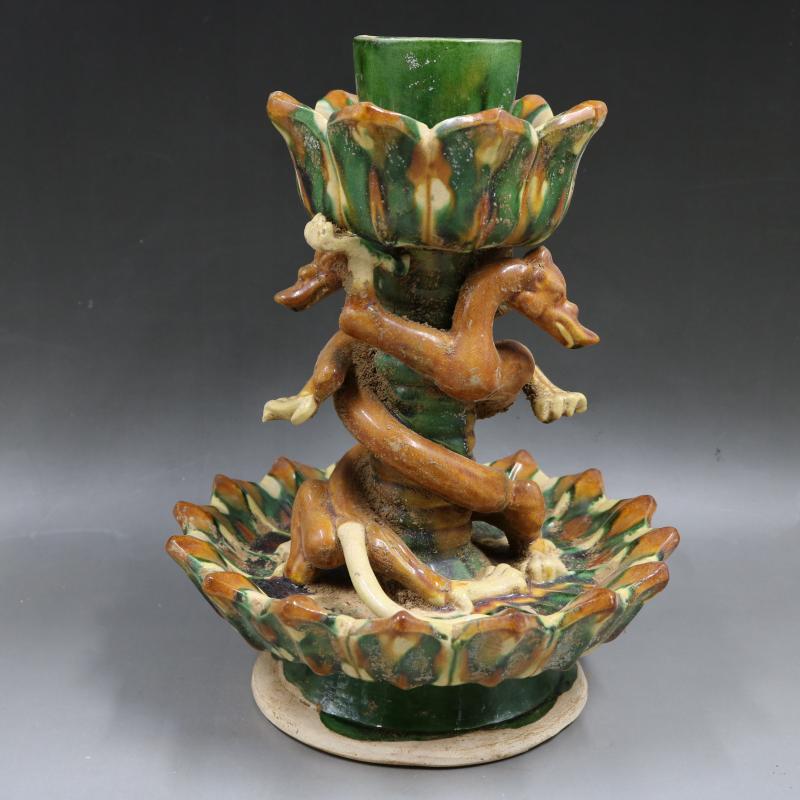 唐三彩浮雕刻花雙龍燭臺仿古老貨包老家居瓷器擺件古董古玩收藏1入
