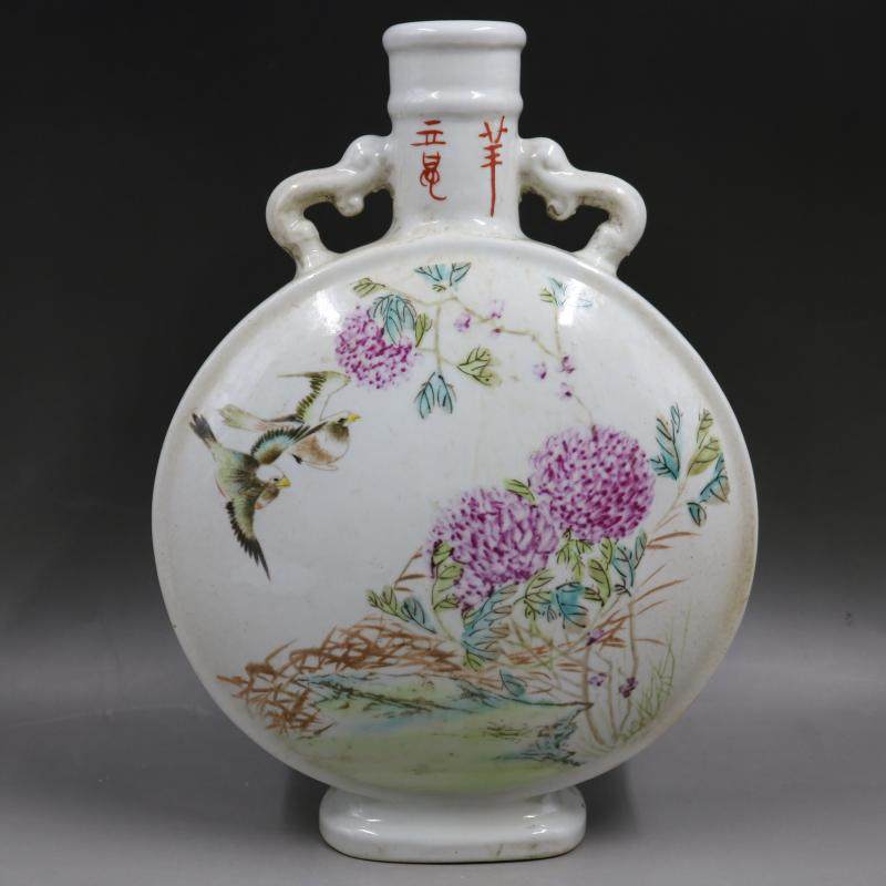 民國粉彩菊花花鳥抱月扁瓶仿古老貨瓷器家居擺件古董古玩老貨收藏1入