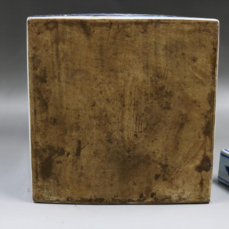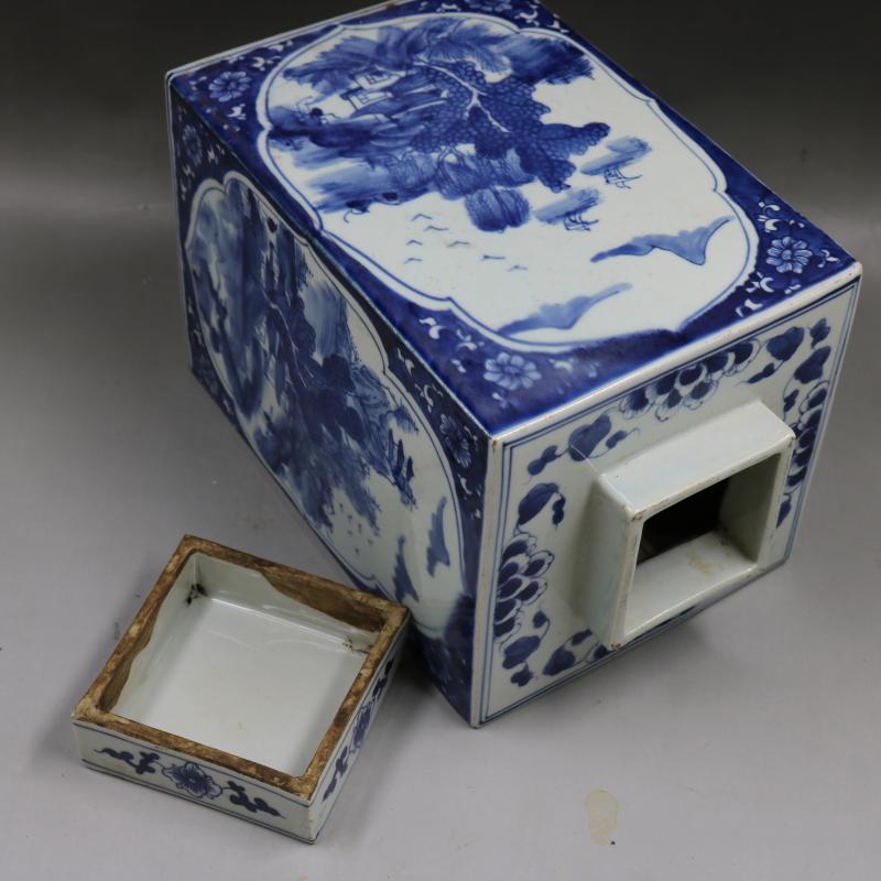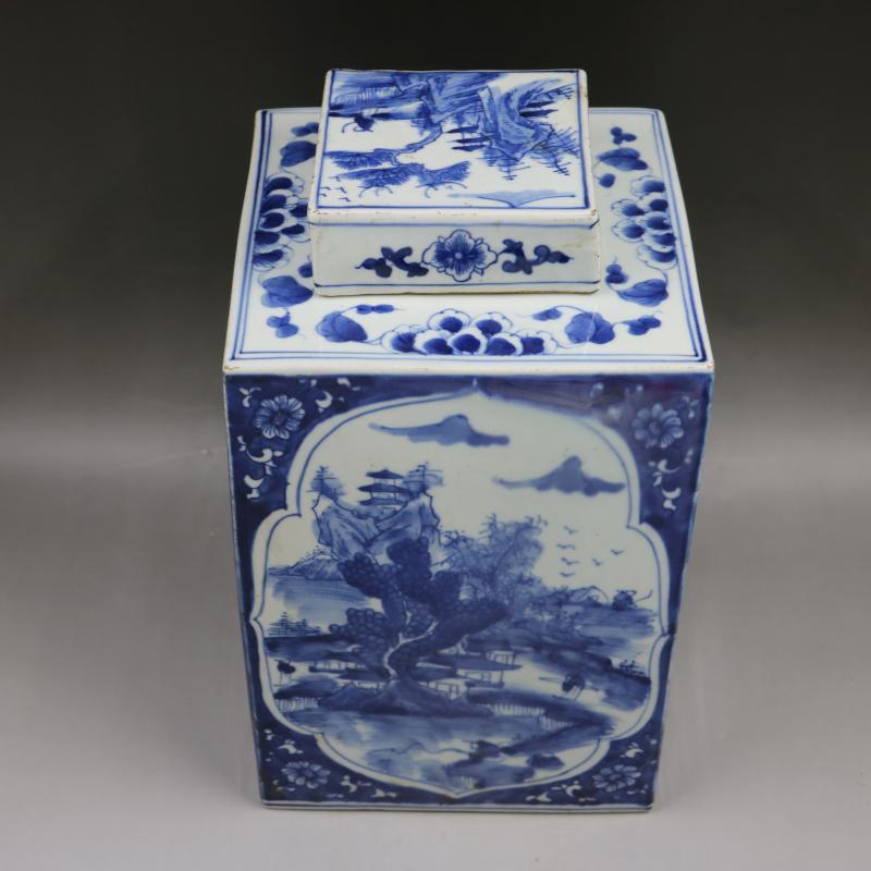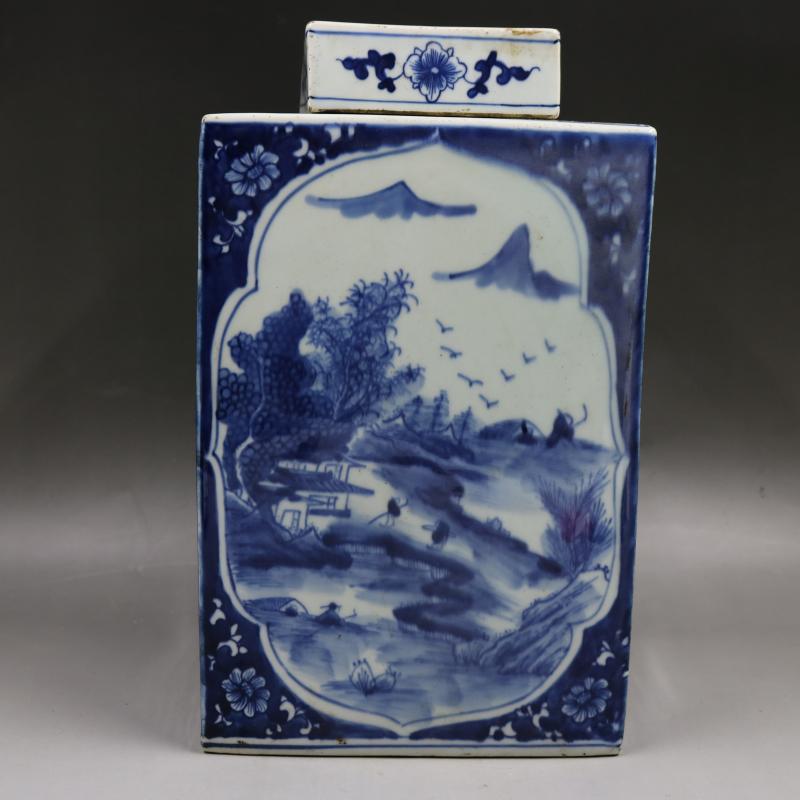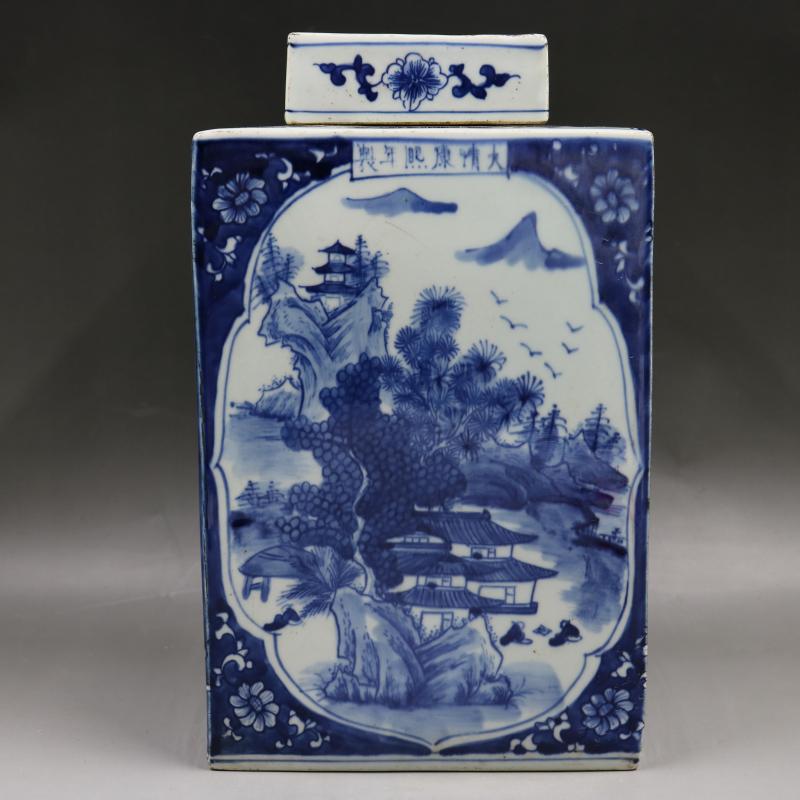 大清康熙年制青花山水四方茶葉罐手繪老貨瓷器家居擺件古董古玩1入