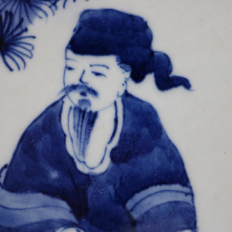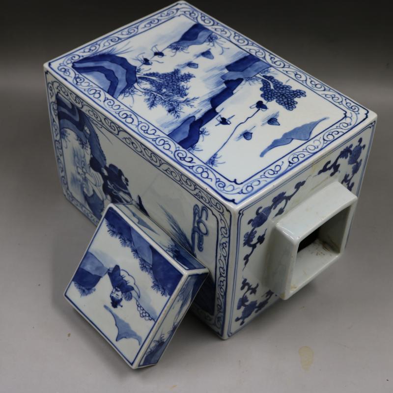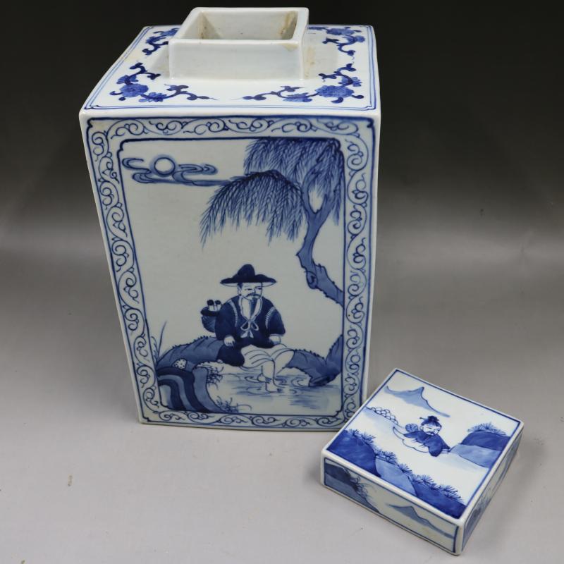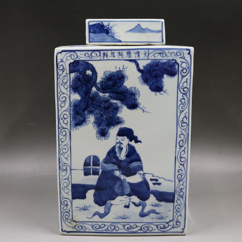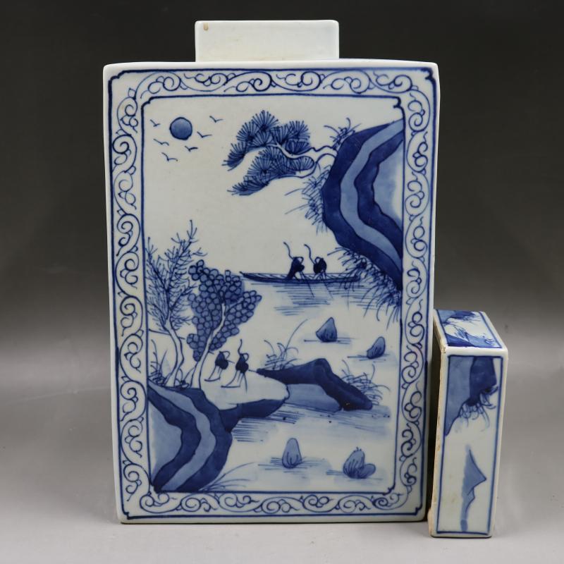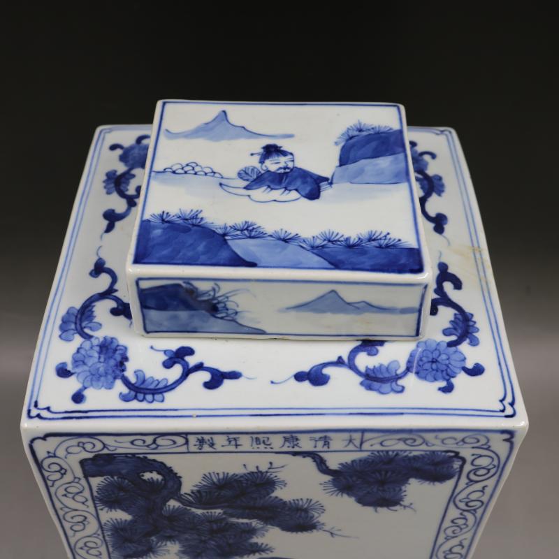 清康熙年制青花山水人物四方茶葉罐手繪仿古瓷器家居擺件古董古玩1入