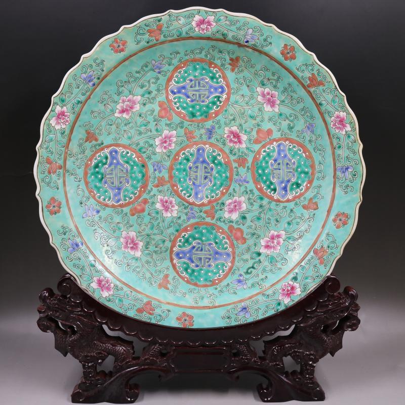 清康熙年制綠地粉彩富貴長壽葵口大盤仿古老貨瓷器家居古玩擺件1入
