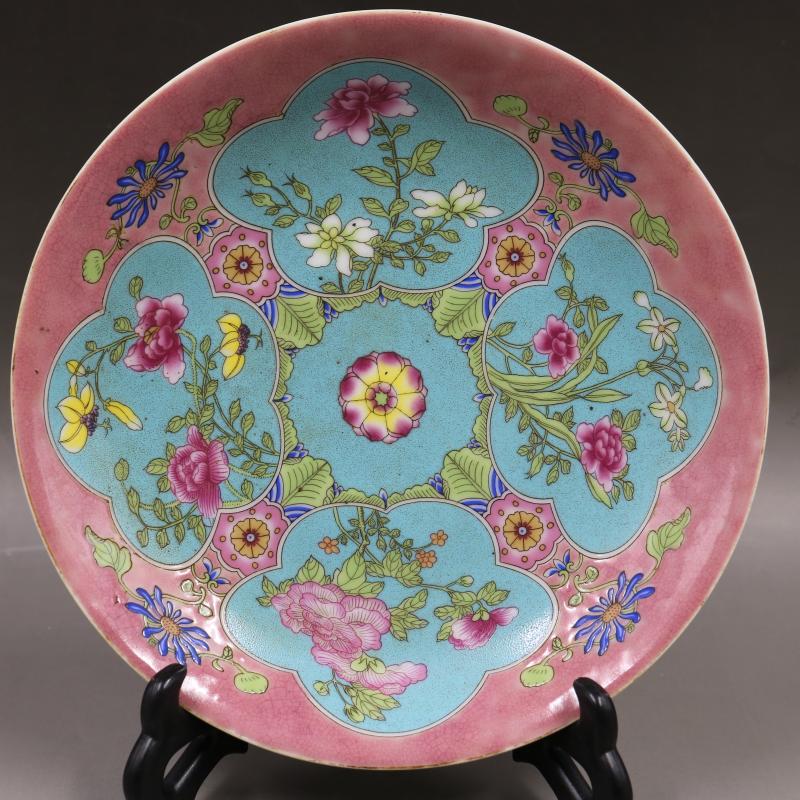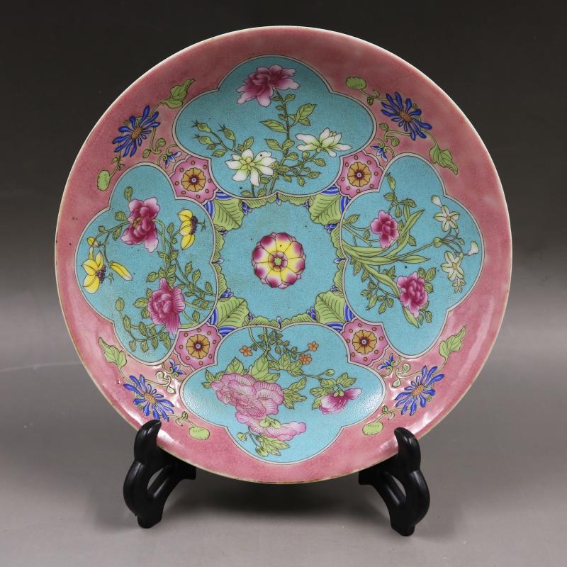 大清康熙粉紅地琺瑯彩開光花卉盤高仿古瓷器家居擺件古董古玩收藏1入