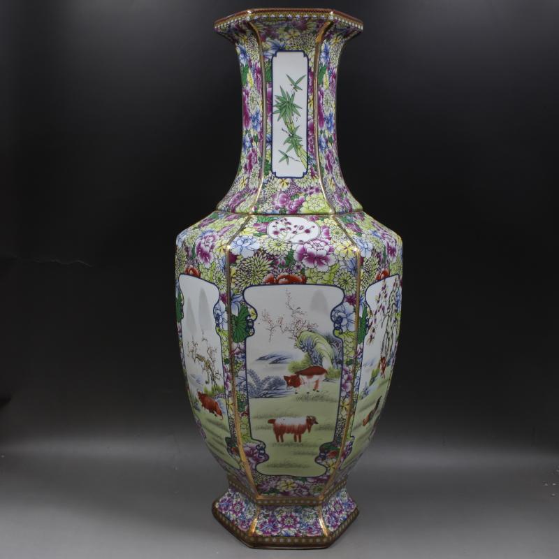 大清乾隆年制描金琺瑯彩萬花十二生肖六方瓶家居觀賞仿古瓷器擺件1入