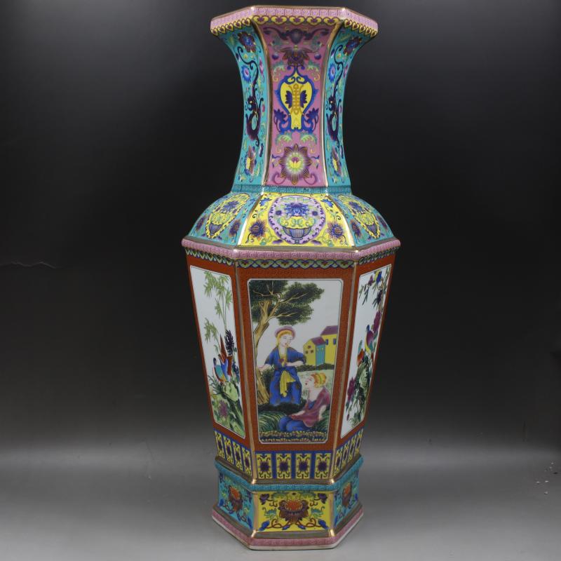 大清乾隆年制描金琺瑯彩人物花鳥六方瓶家居觀賞仿古瓷器古玩擺件1入