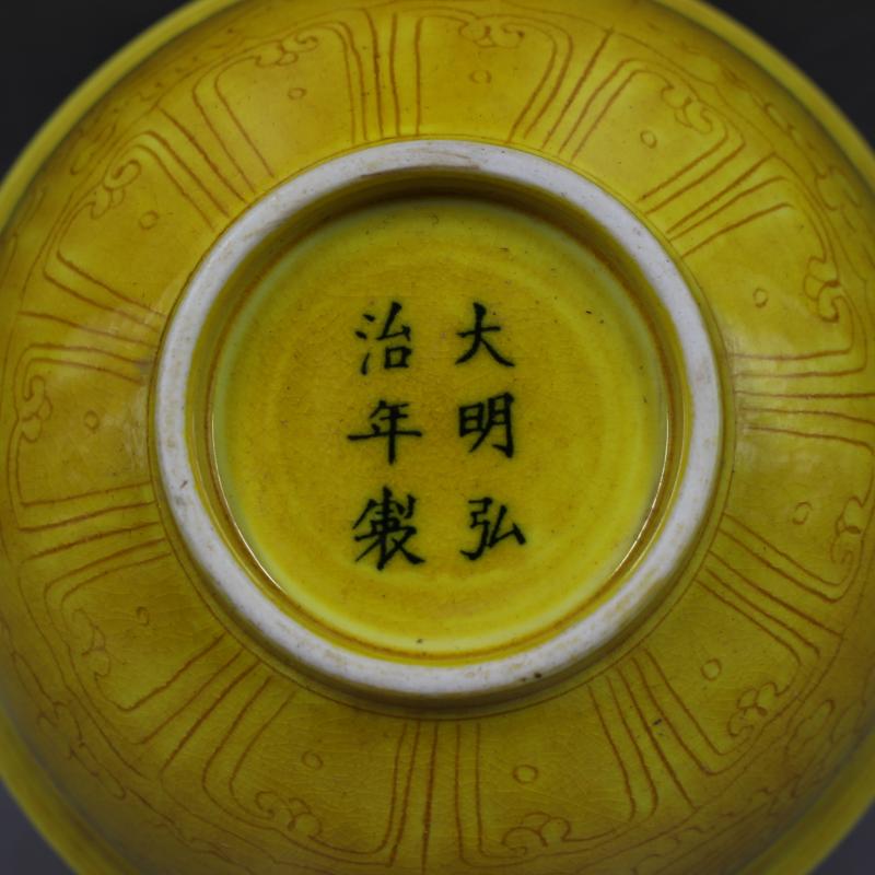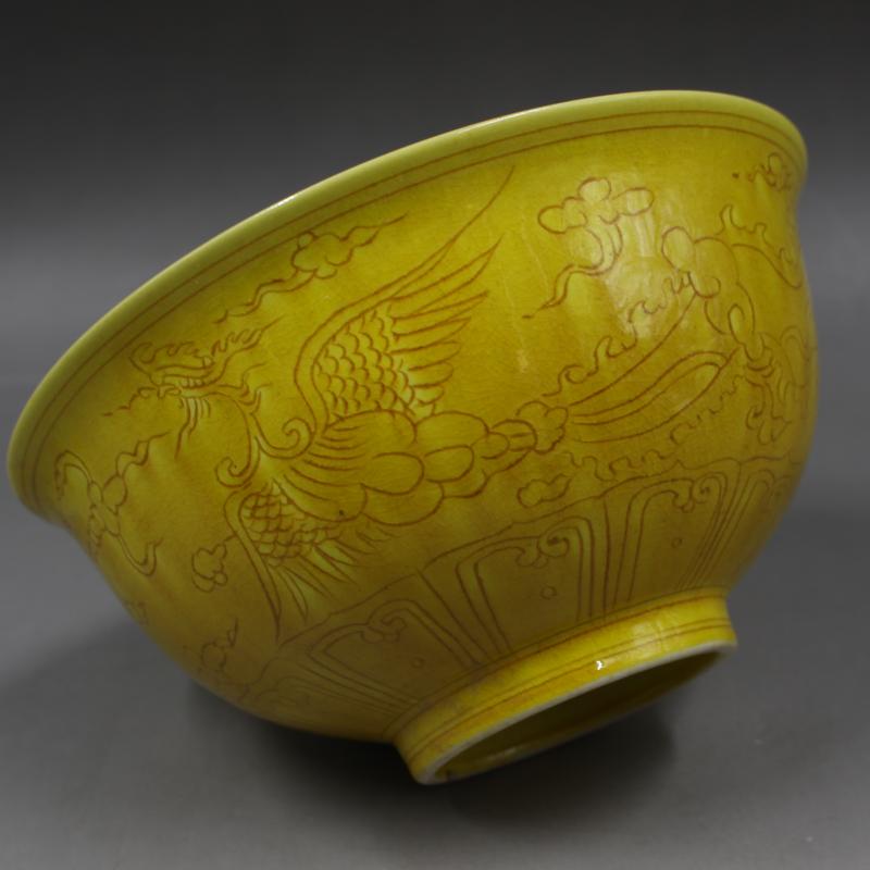 大明弘治年制黃釉雕刻鳳紋碗手工仿古瓷器家居擺件古董古玩收藏1入