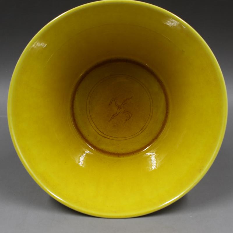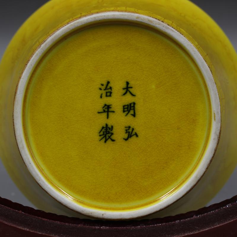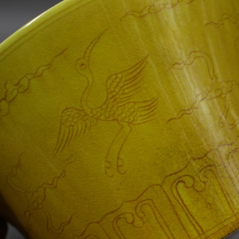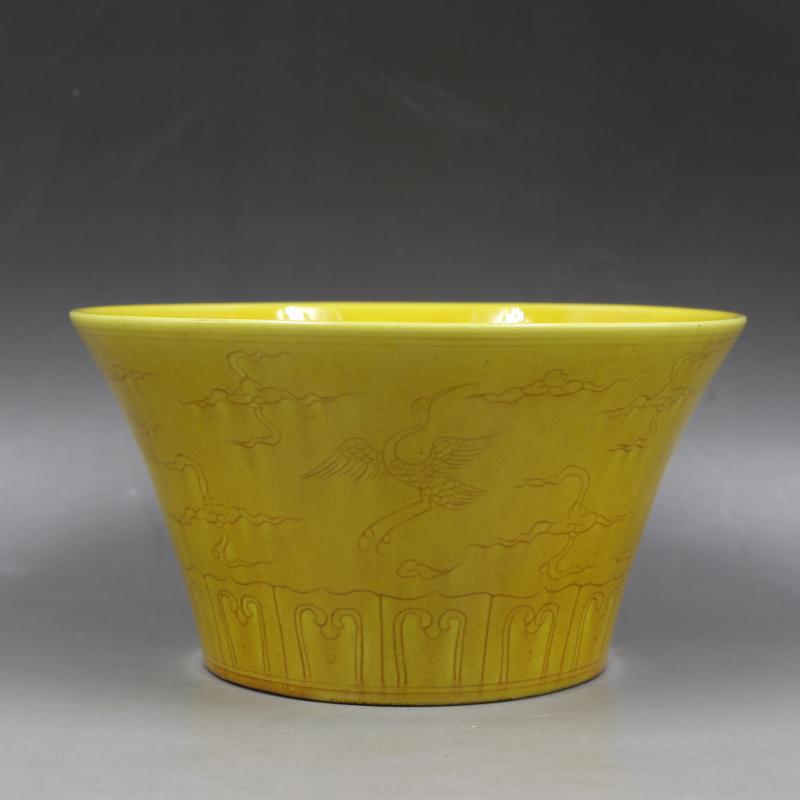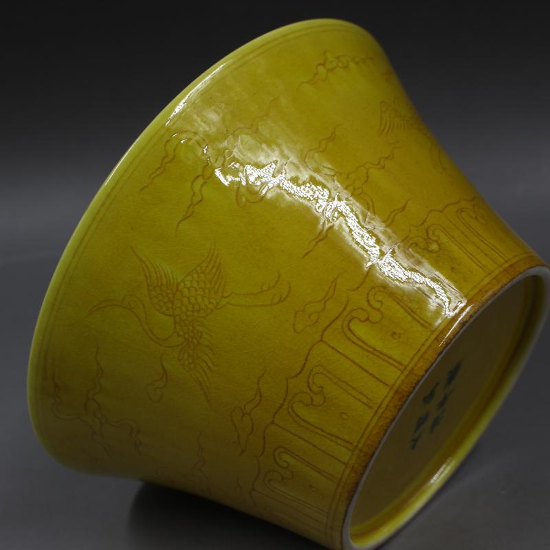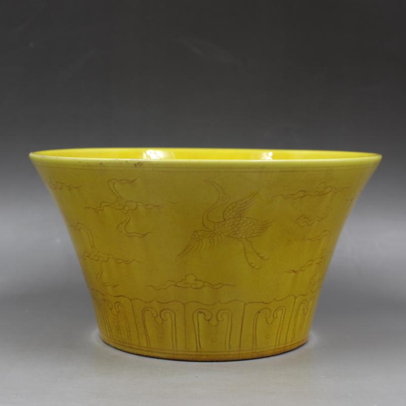大明弘治年制黃釉雕刻鶴紋馬蹄碗手工仿古瓷器家居擺件古董古玩1入
