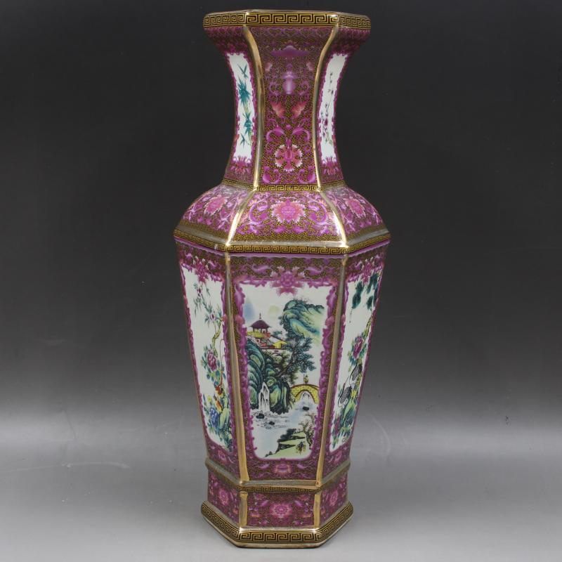大清乾隆年制描金琺瑯彩山水花鳥六方瓶家居觀賞仿古瓷器古玩擺件1入