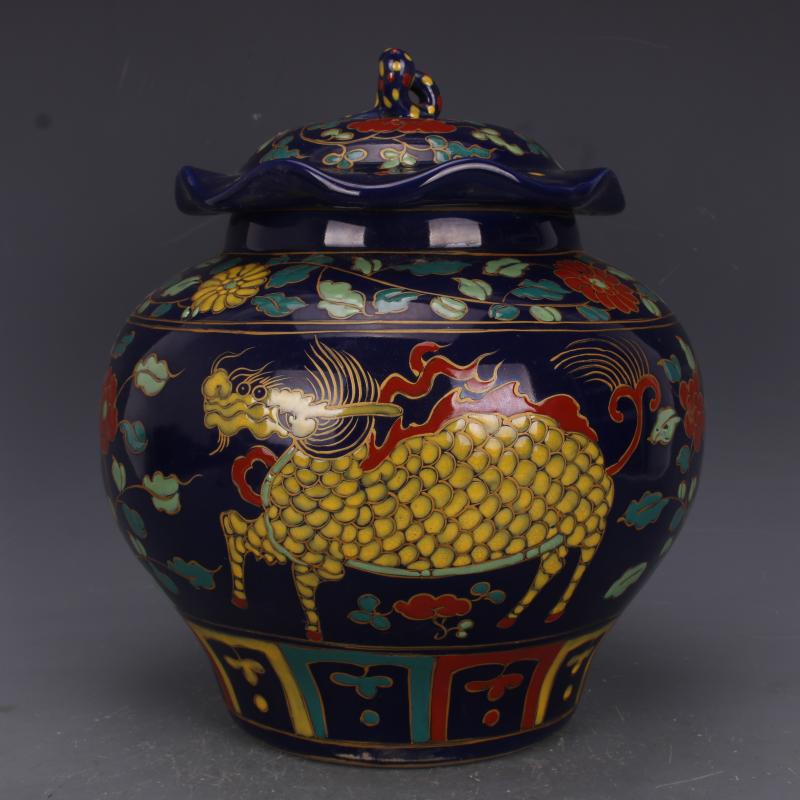 大明宣德年制祭藍釉五彩麒麟紋蓋罐手繪仿古瓷器擺件古董古玩收藏1入