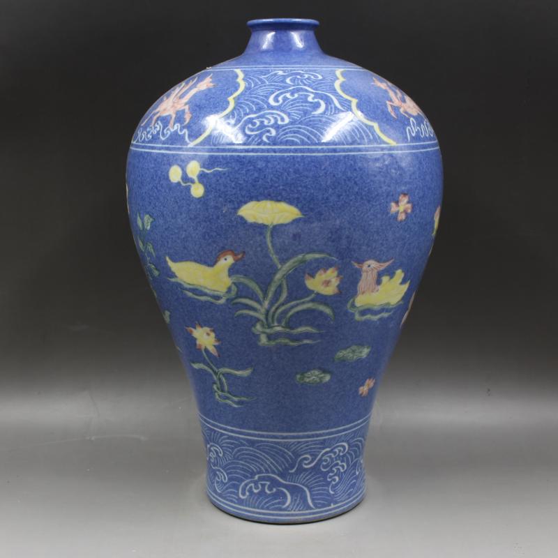 大明宣德年制雪花藍釉刻荷花鴛鴦梅瓶手工仿古瓷器家居古玩擺件1入