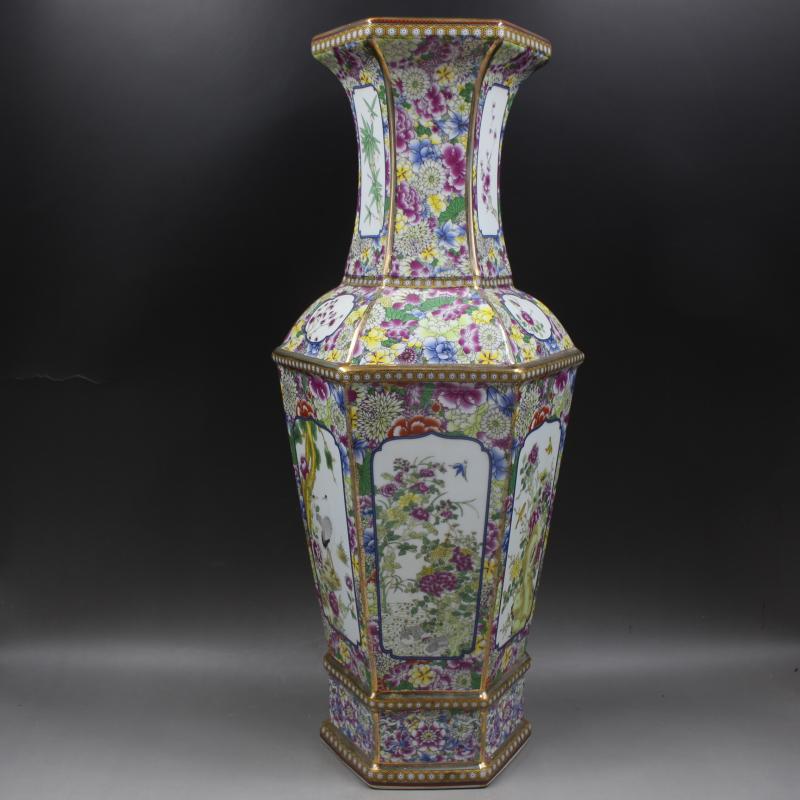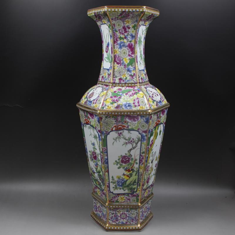 清乾隆年制描金琺瑯彩萬花花鳥六方花瓶仿古瓷器家居擺件古董古玩1入
