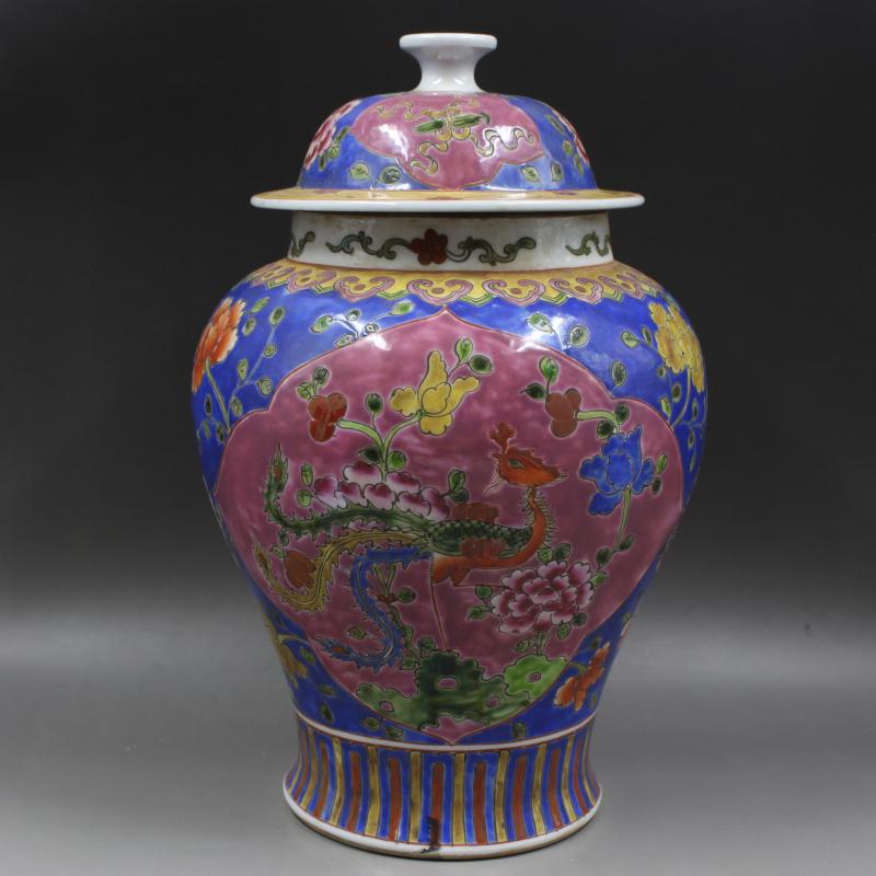 清中期粉彩鳳戲牡丹將軍罐手繪仿古老貨瓷器家居擺件古董古玩收藏1入