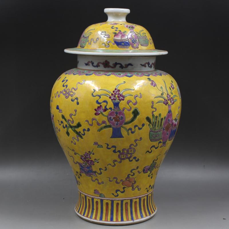 清中期黃地粉彩博古紋將軍罐手繪仿古老貨瓷器家居擺件古董古玩1入