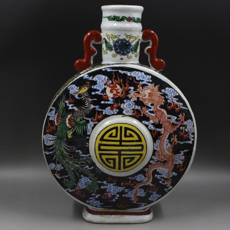 大清康熙年制黑地粉彩龍鳳紋抱月瓶仿古老貨瓷器家居擺件古董古玩1入