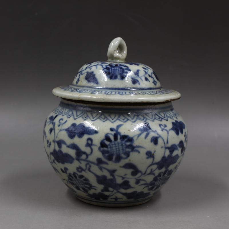大明宣德年制青花纏枝花紋蓋罐手繪仿古瓷器家居擺件古董古玩收藏1入