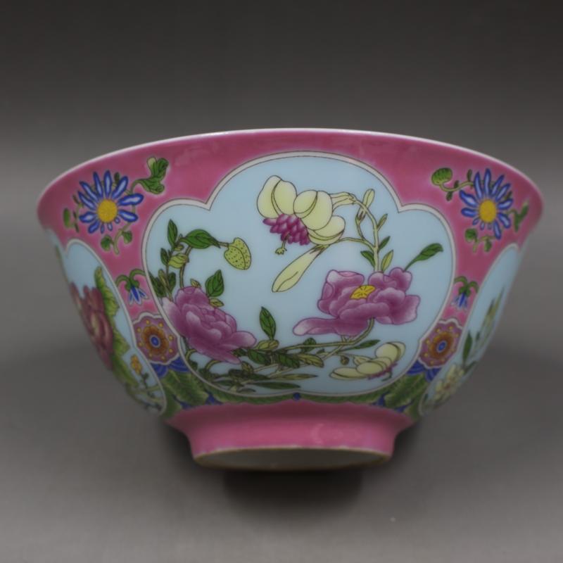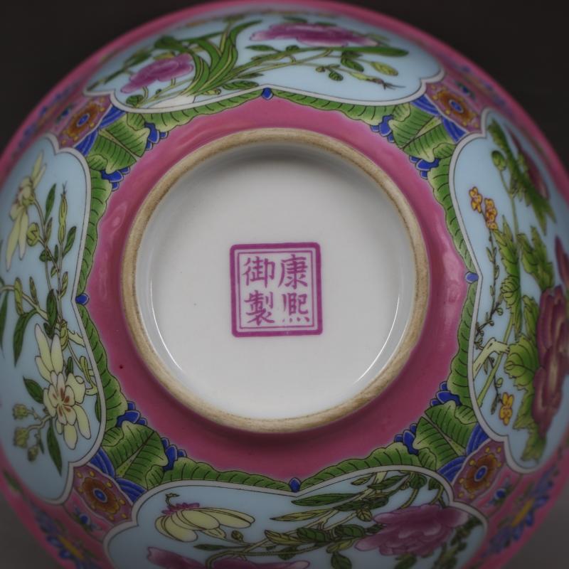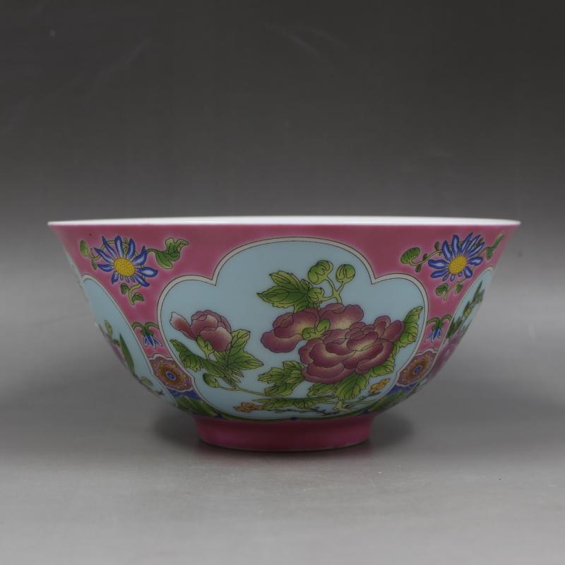大清康熙粉紅地琺瑯彩開光花卉碗高仿古瓷器家居擺件古董古玩收藏1入