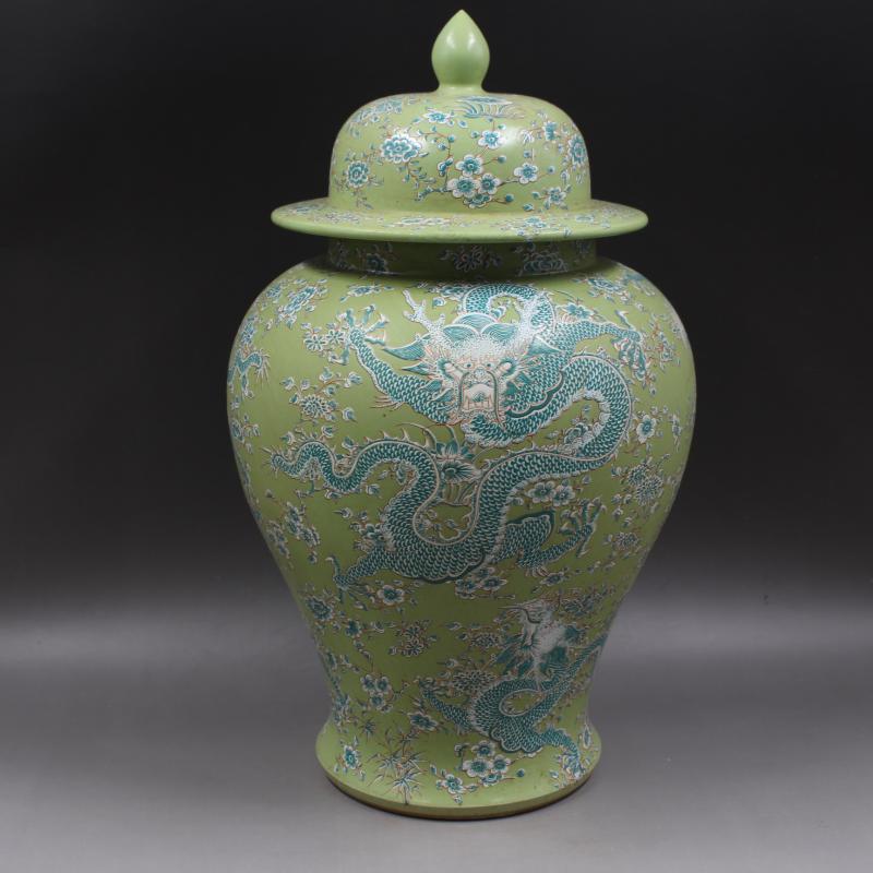 大清康熙年制無光綠釉粉綠彩龍紋將軍罐仿古瓷器家居擺件古董古玩1入