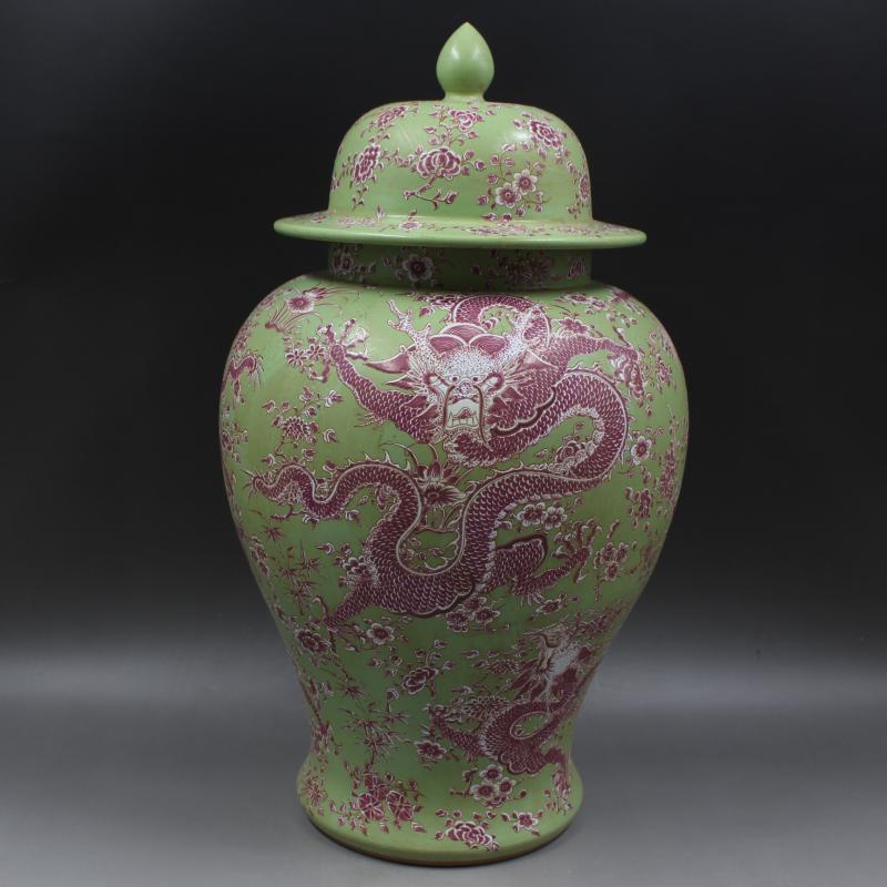 大清康熙年制無光綠釉粉紅彩龍紋將軍罐仿古瓷器家居擺件古董古玩1入