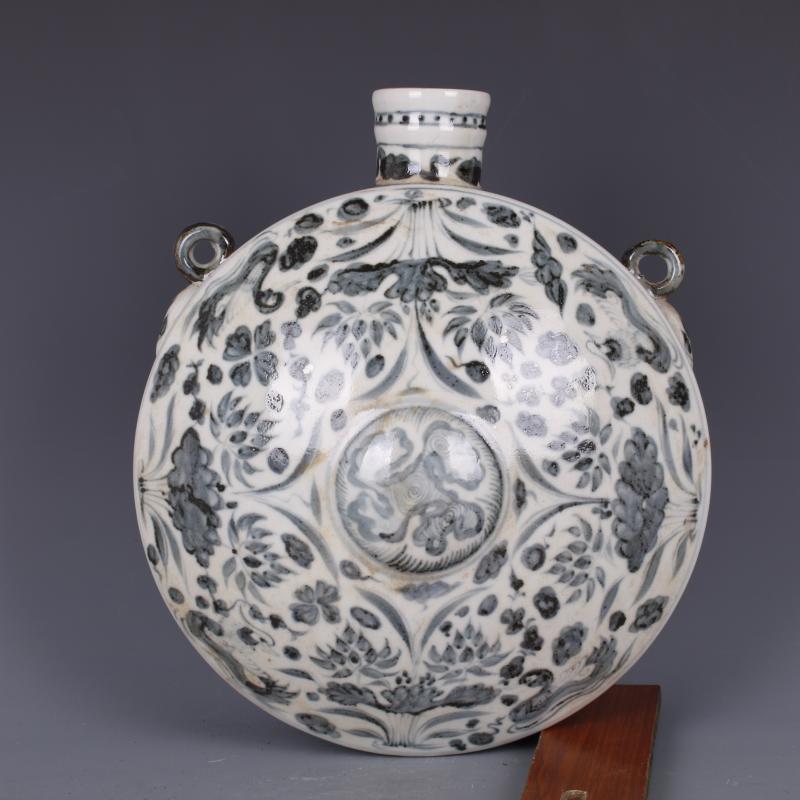 元青花荷花鴛鴦紋抱月壁瓶扁瓶手繪仿古老貨瓷器家居擺件古董古玩1入