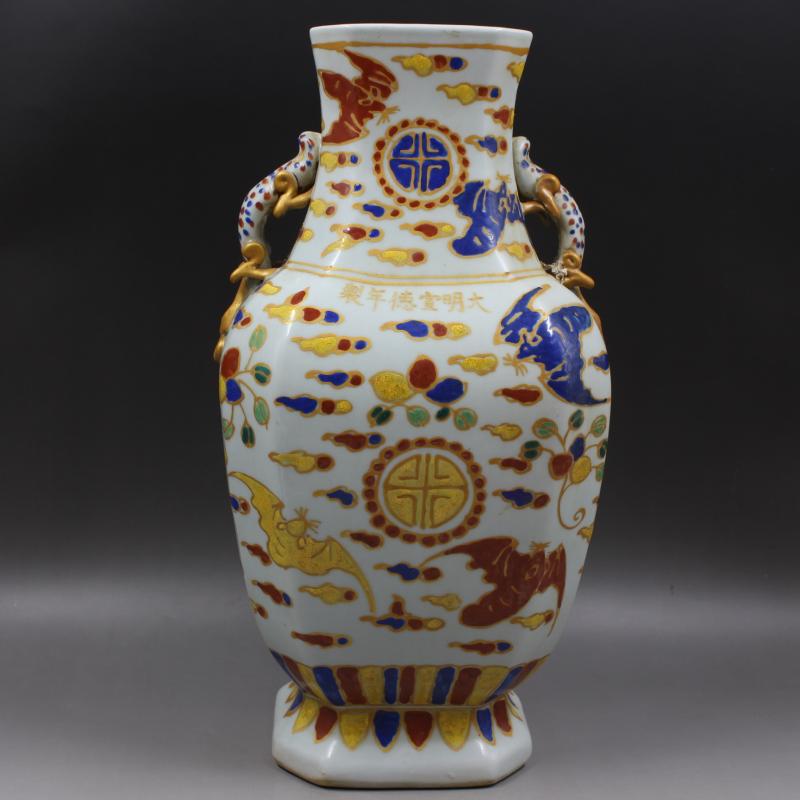大明宣德年制五彩福壽龍耳四方瓶手繪仿古老貨瓷器擺件古董古玩1入