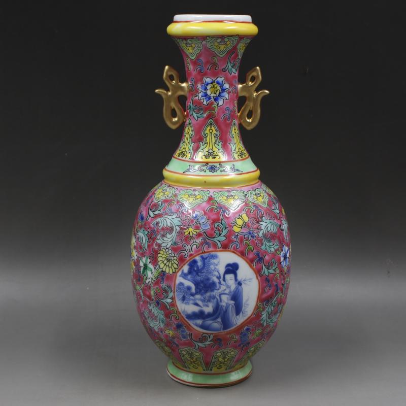 大清雍正年制紅地青花粉彩人物賞瓶家居仿古瓷器擺件古董古玩收藏1入