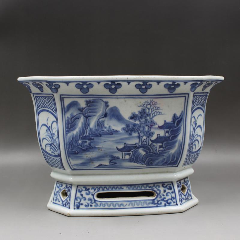 清雍正年制青花山水四方鑲器花盆純手工仿古老貨瓷器擺件古董古玩1入
