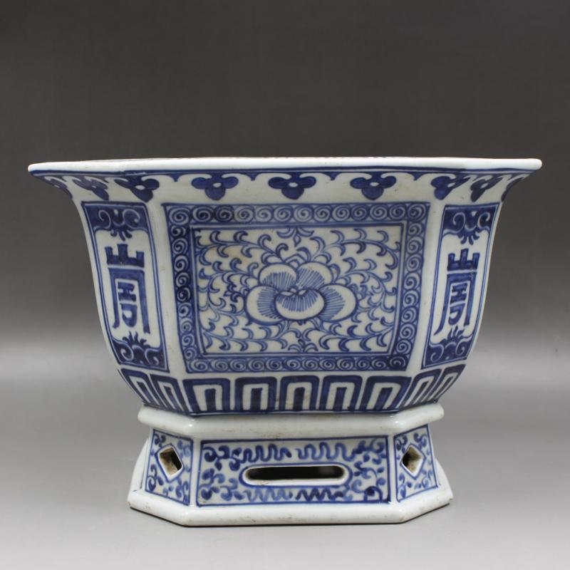 清雍正年制青花壽紋四方鑲器花盆純手工仿古老貨瓷器擺件古董古玩1入