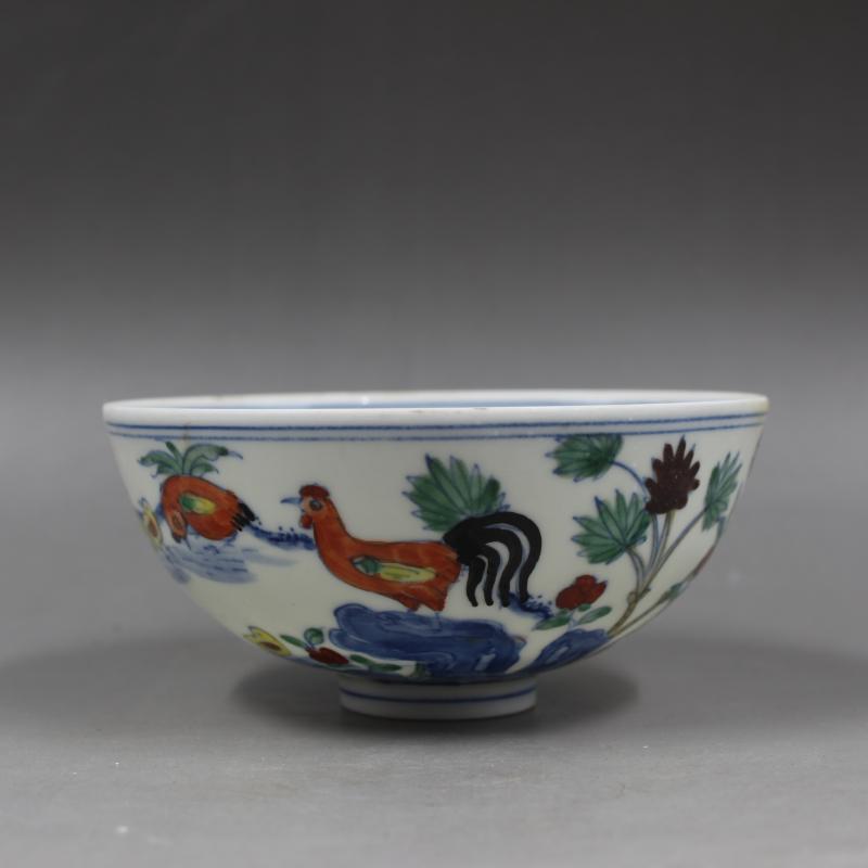 大明成化年制青花斗彩雞紋超薄胎碗手繪仿古瓷器擺件古董古玩收藏1入