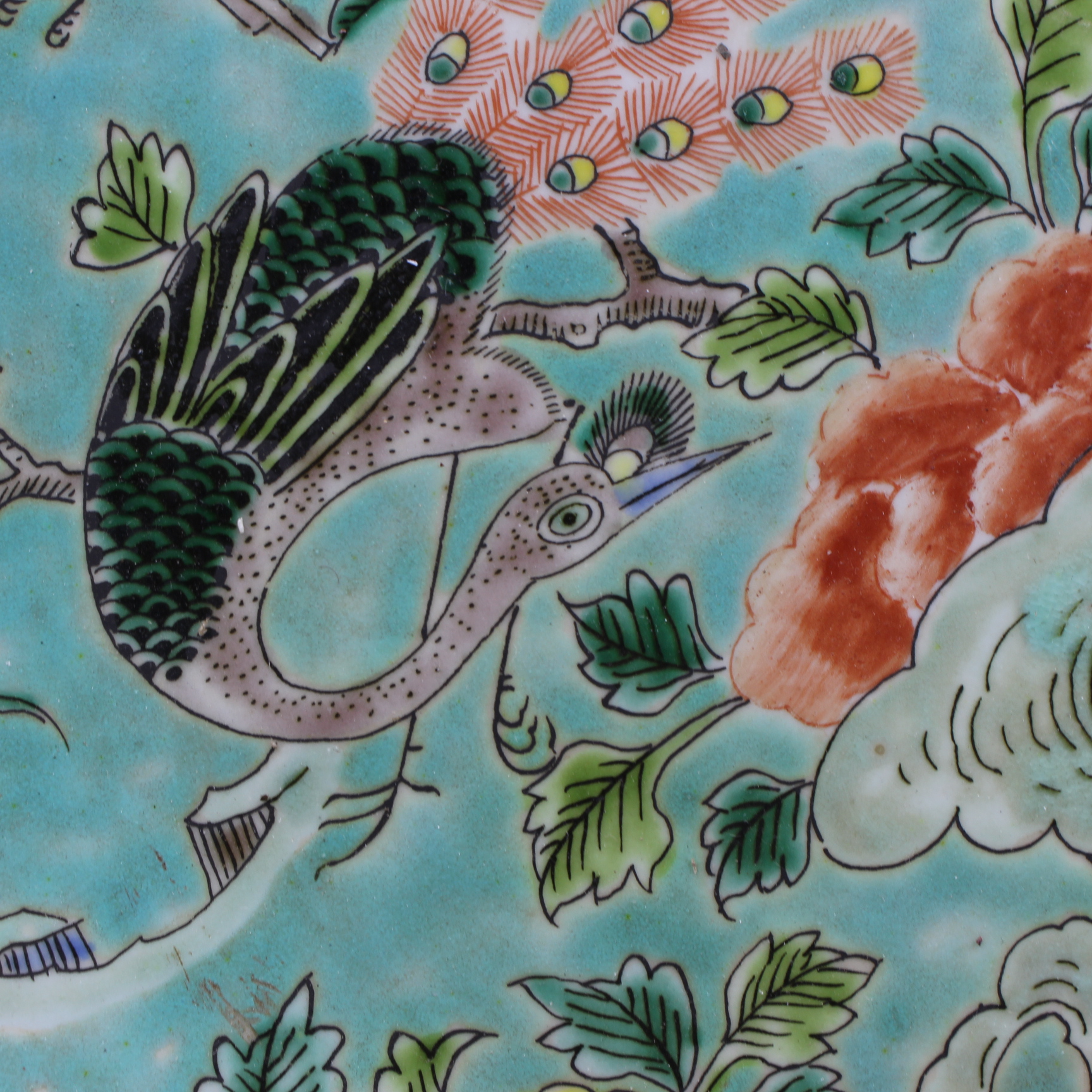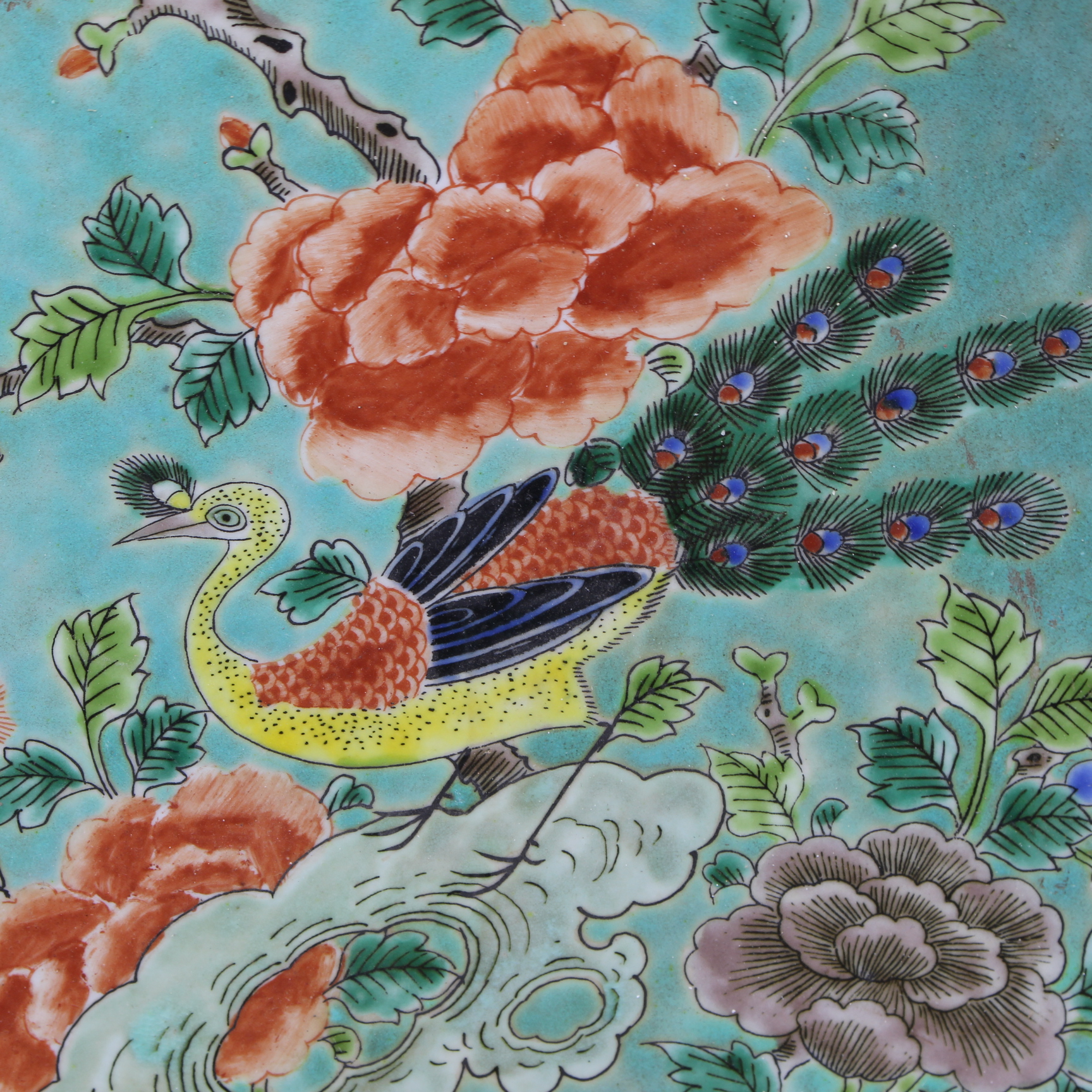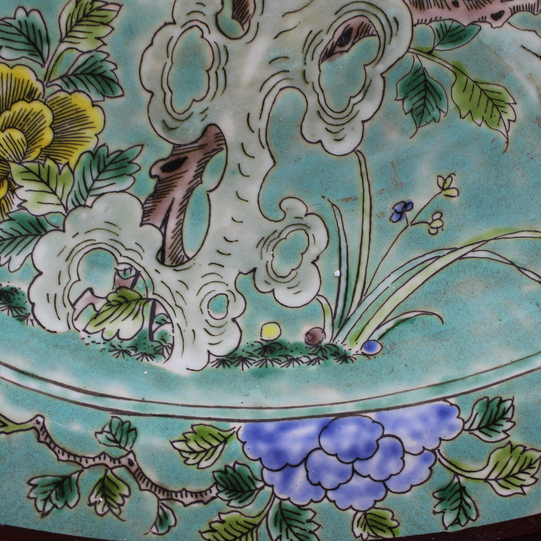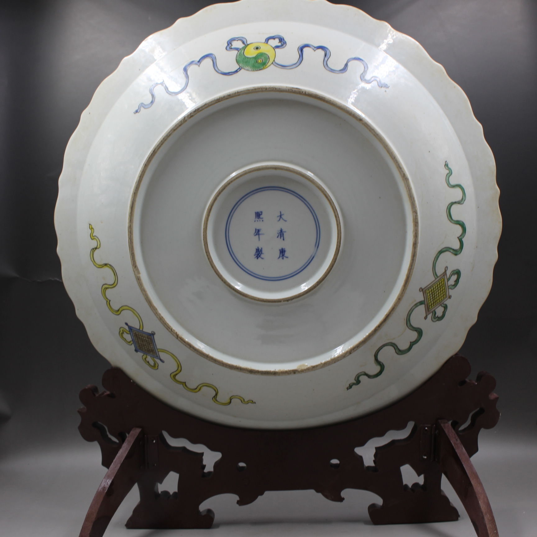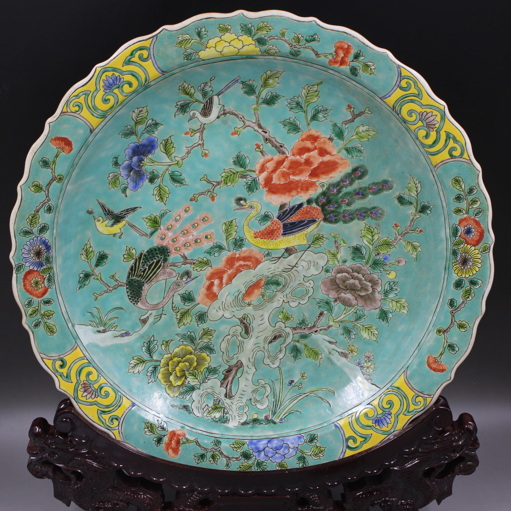 大清康熙年制綠地粉彩花鳥葵口大盤仿古老貨瓷器家居擺件古董古玩1入