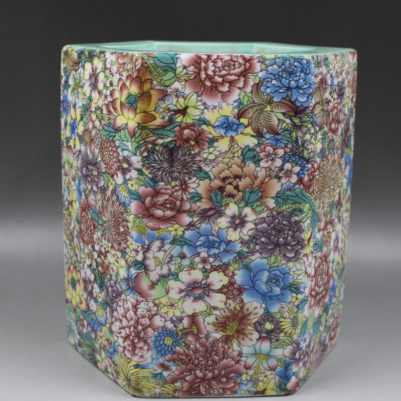 大清乾隆年制粉彩萬花紋六方筆筒筆海仿古文房擺件瓷器古董古玩1入