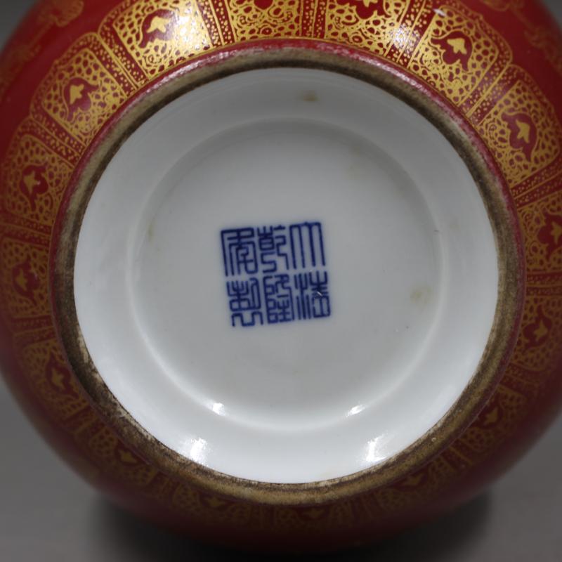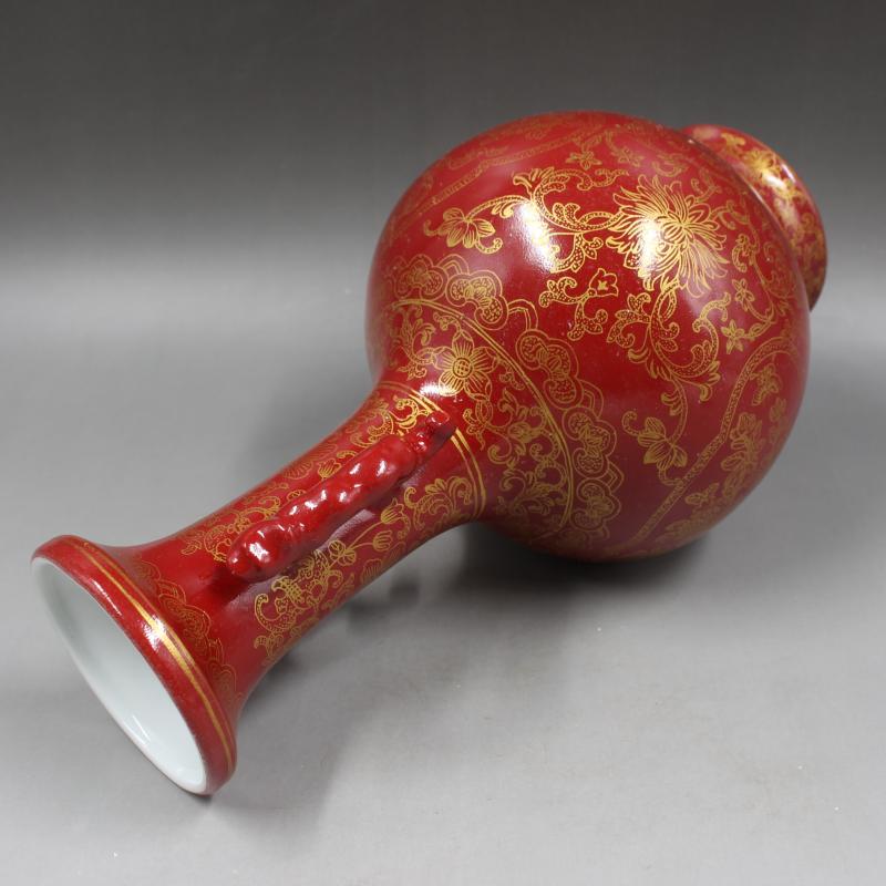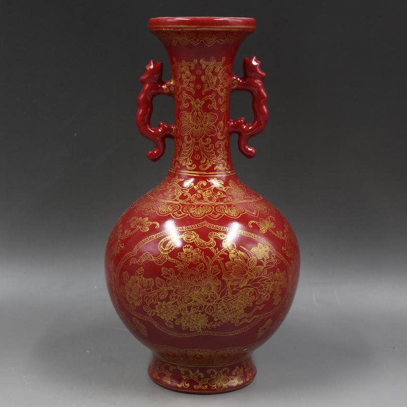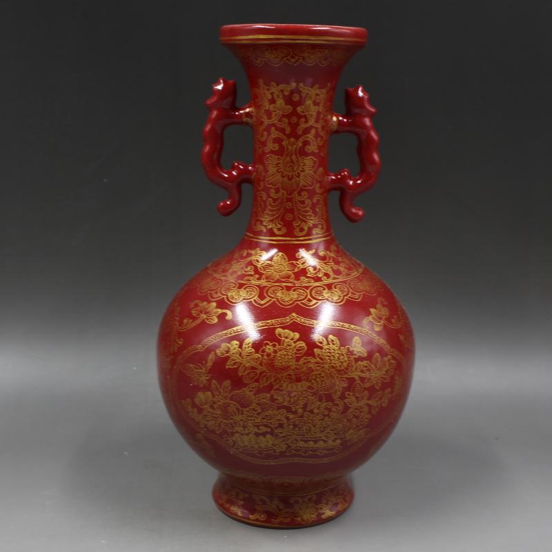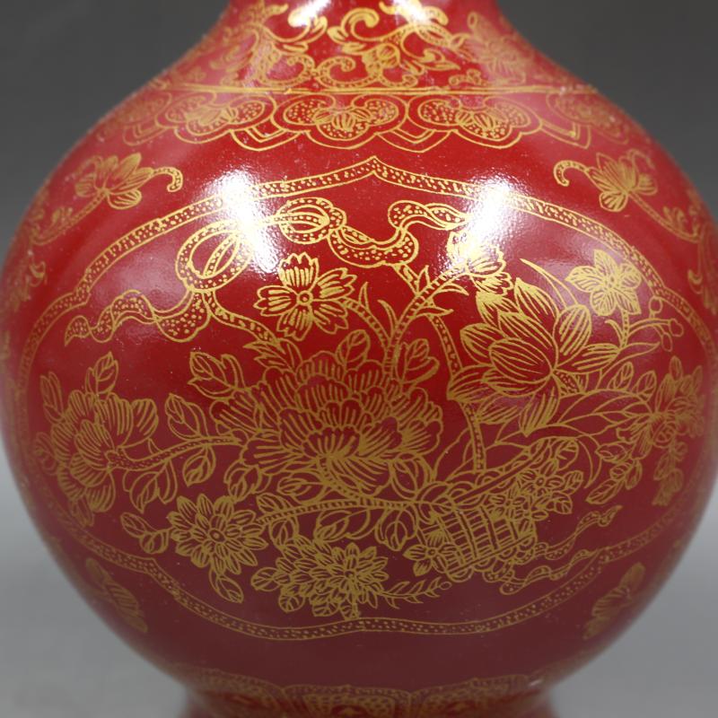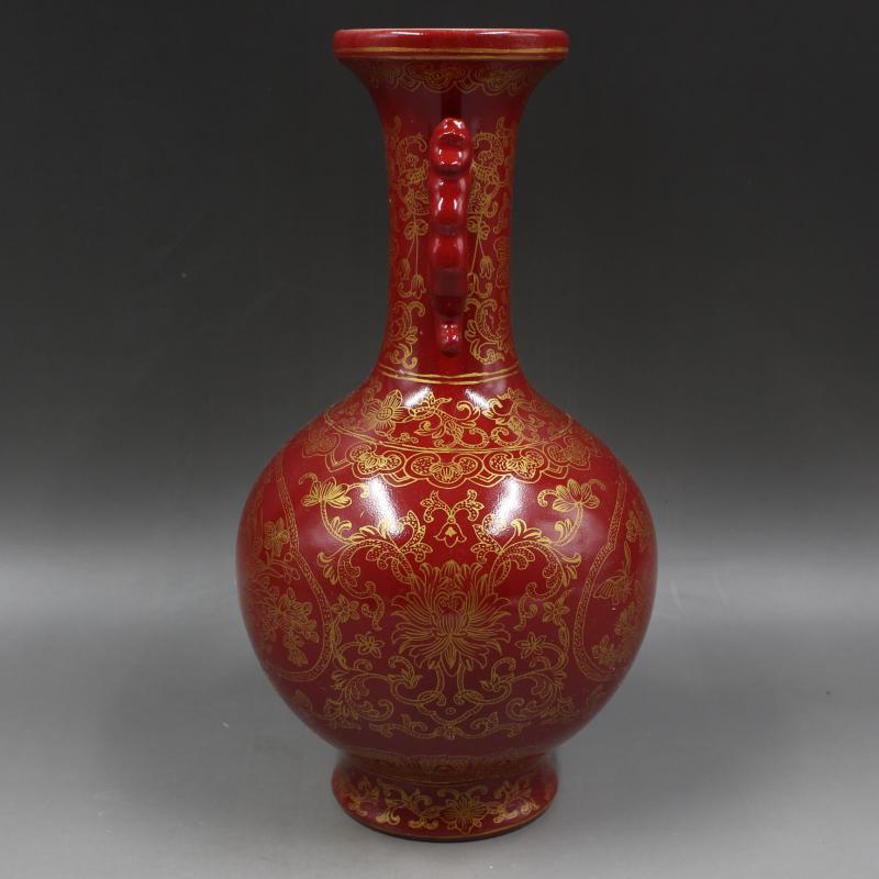 大清乾隆年制雞血紅描金花紋長頸瓶仿古觀賞瓷器擺件古董古玩收藏1入