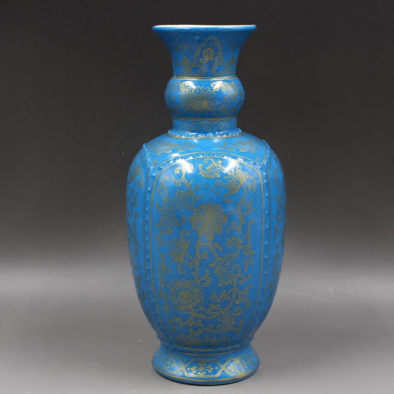 大清乾隆年制天藍地描金花紋蒜頭瓶仿古觀賞瓷器擺件古董古玩收藏1入